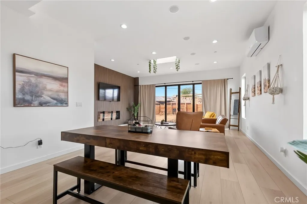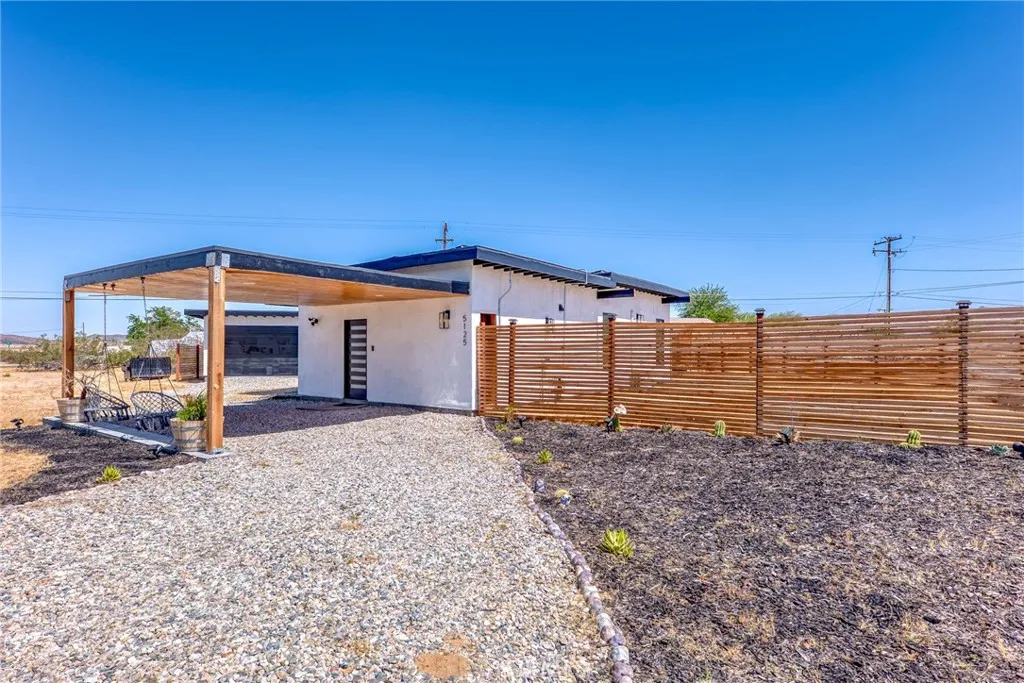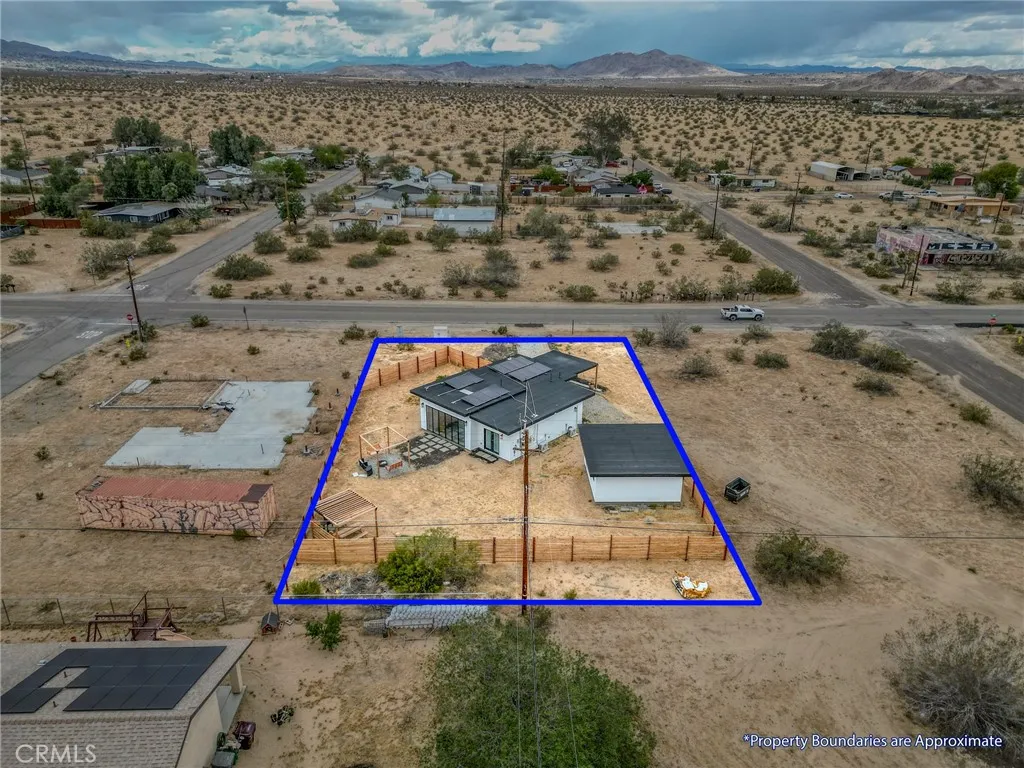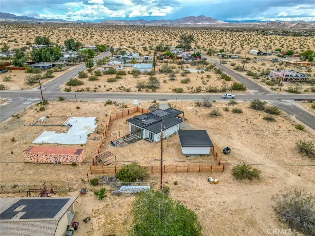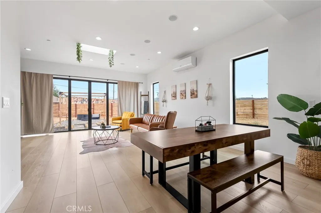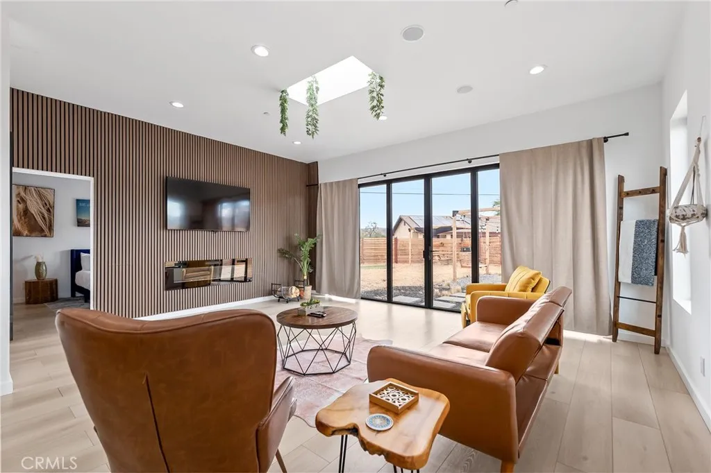 Welcome to Sunfair Palms, a soulful desert sanctuary nestled in the heart of Joshua Tree where modern luxury meets the quiet magic of the high desert. This fully electric home is as efficient as it is enchanting, featuring a paid off 10 kW solar system and a suite of smart home features designed for effortless living. From the moment you step inside, you are greeted by a warm, light filled interior where thoughtful design and natural textures create a sense of calm and connection. The living room is a true showpiece, highlighted by an inviting electric fireplace, a skylight that pours in golden desert light, acoustic accent paneling, recessed lighting, and six stunning glass doors that dissolve the boundary between indoors and out. The kitchen is both elegant and functional, anchored by striking waterfall countertops and a spacious island with sink, complemented by pendant lighting, recessed lights, and modern floating shelves that add a touch of artistic flair. The open dining area flows seamlessly between the kitchen and living room, perfect for gathering and entertaining. Each bedroom serves as a peaceful retreat, complete with mini split systems, charming wood barn closet doors, and private glass doors that open to the surrounding desert landscape. Both bathrooms are beautifully appointed, offering spa like experiences with curated finishes. One features a walk in shower wrapped in bold black tile with a sleek glass enclosure, while the other showcases a shower and tub combination adorned with blue ceramic subway tile, a glass enclosure, and a refined skirted toilet. Th