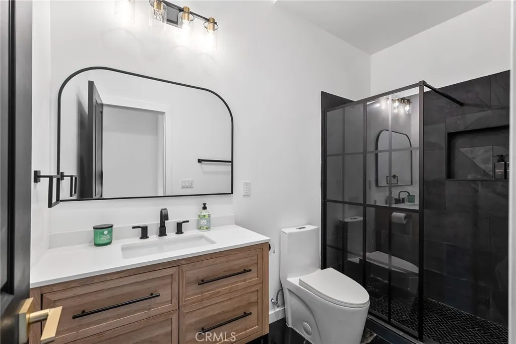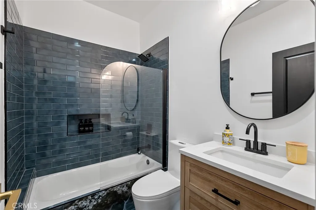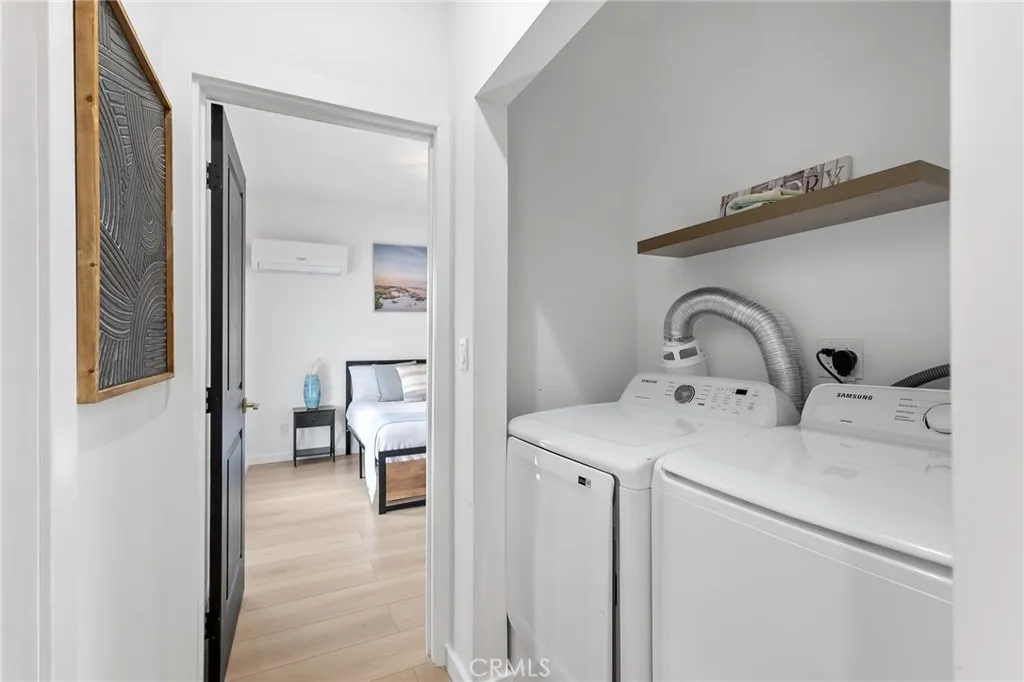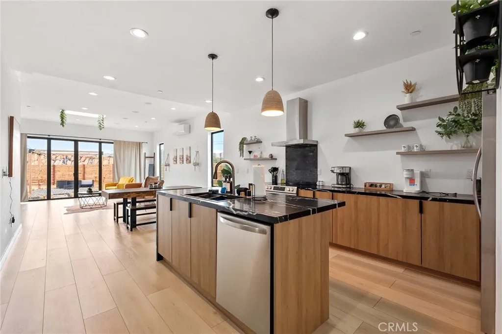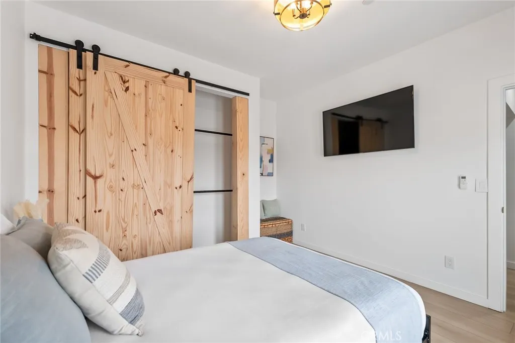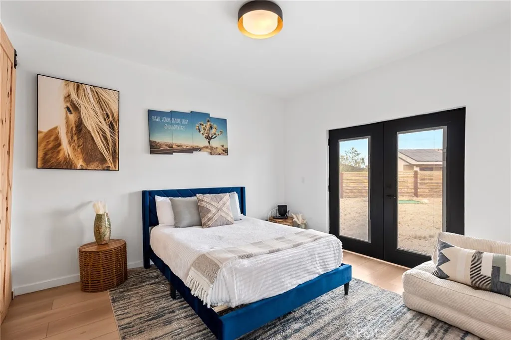 Welcome to Sunfair Palms, a soulful desert sanctuary nestled in the heart of Joshua Tree where modern luxury meets the quiet magic of the high desert. This fully electric home is as efficient as it is enchanting, featuring a paid off 10 kW solar system and a suite of smart home features designed for effortless living. From the moment you step inside, you are greeted by a warm, light filled interior where thoughtful design and natural textures create a sense of calm and connection. The living room is a true showpiece, highlighted by an inviting electric fireplace, a skylight that pours in golden desert light, acoustic accent paneling, recessed lighting, and six stunning glass doors that dissolve the boundary between indoors and out. The kitchen is both elegant and functional, anchored by striking waterfall countertops and a spacious island with sink, complemented by pendant lighting, recessed lights, and modern floating shelves that add a touch of artistic flair. The open dining area flows seamlessly between the kitchen and living room, perfect for gathering and entertaining. Each bedroom serves as a peaceful retreat, complete with mini split systems, charming wood barn closet doors, and private glass doors that open to the surrounding desert landscape. Both bathrooms are beautifully appointed, offering spa like experiences with curated finishes. One features a walk in shower wrapped in bold black tile with a sleek glass enclosure, while the other showcases a shower and tub combination adorned with blue ceramic subway tile, a glass enclosure, and a refined skirted toilet. Th