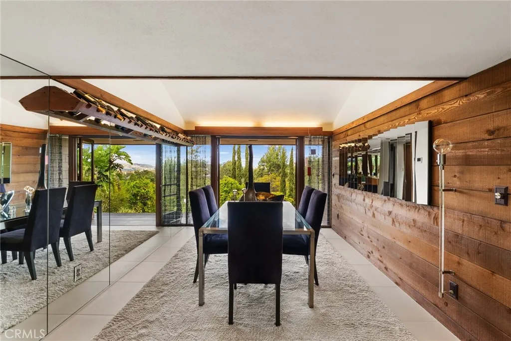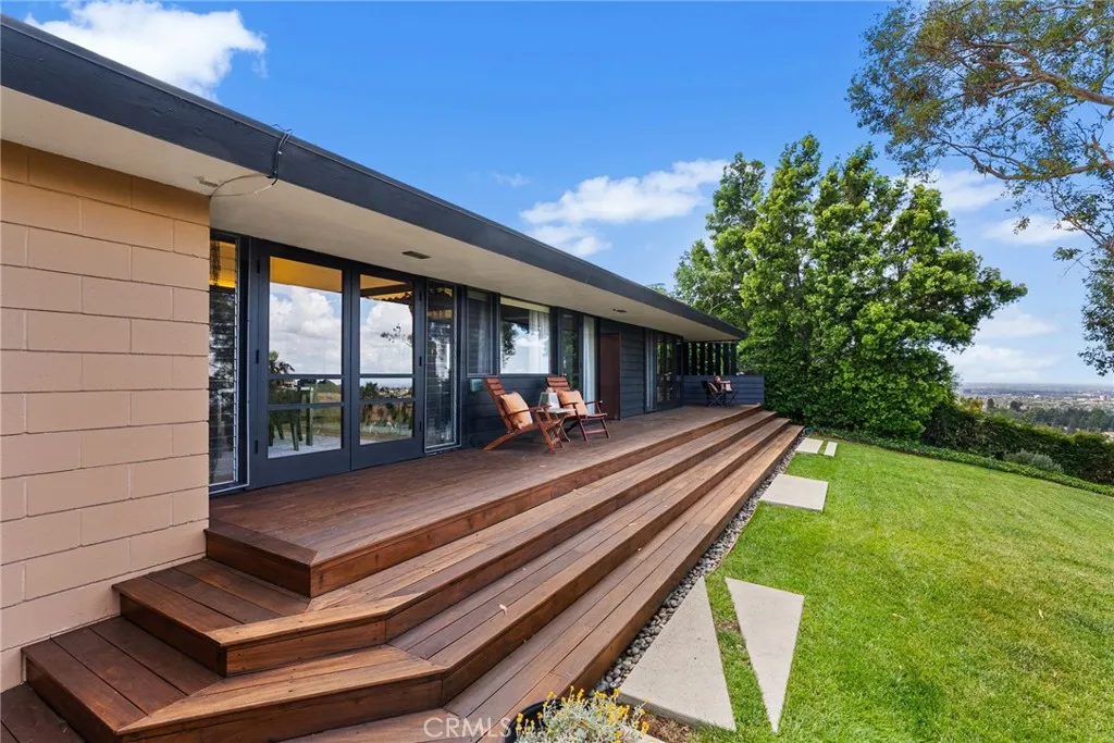 Perched above Lemon Heights, this exceptional single-story mid-century modern home showcases sweeping 180-degree views from Catalina Island to Palos Verdes, framed by rolling hills and mountainsenjoyed from nearly every room and carried throughout the indoor-outdoor living experience. Designed by a protg of Frank Lloyd Wright and inspired by the iconic Rosenbaum House, the residence embodies organic modernism with clean lines, natural materials, and a strong architectural presence. Inside, soaring post-and-beam ceilings, skylights, and expansive walls of glass fill the open living spaces with light, blurring the line between indoors and out. The home is designed for both relaxed living and entertaining, featuring a dramatic great room that flows effortlessly to multiple patios, an impressive 2,500-square-foot wraparound Ironwood deck, and a grass yardall thoughtfully positioned to capture views in every direction. The kitchen opens to the den and overlooks the pool area, complete with a firepit and expansive patios for outdoor enjoyment, while the formal dining room opens directly to the impressive deck for indoor-outdoor entertaining. The updated kitchen connects to the main living areas. The flexible layout includes a private primary suite, two additional bedrooms, a detached guest studio, and a pool tucked into the hillside. Complete with a three-car garage and workshop, this is a rare architectural retreat offering privacy, style, and breathtaking views from nearly every vantage point. Set on an expansive lot, this is more than a homeits a rare architectural statement a