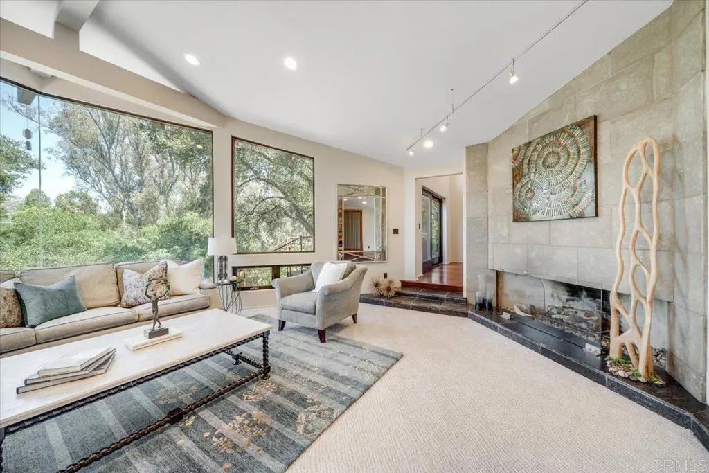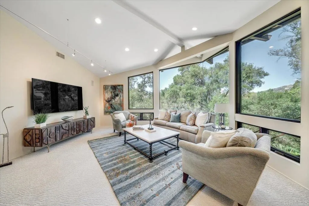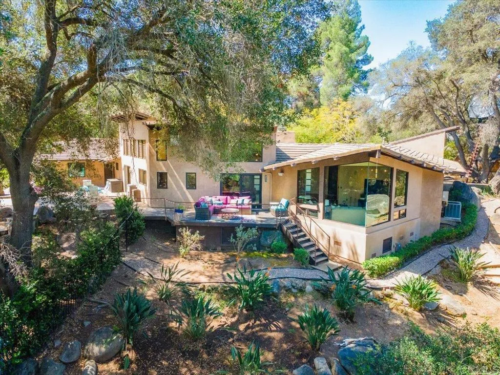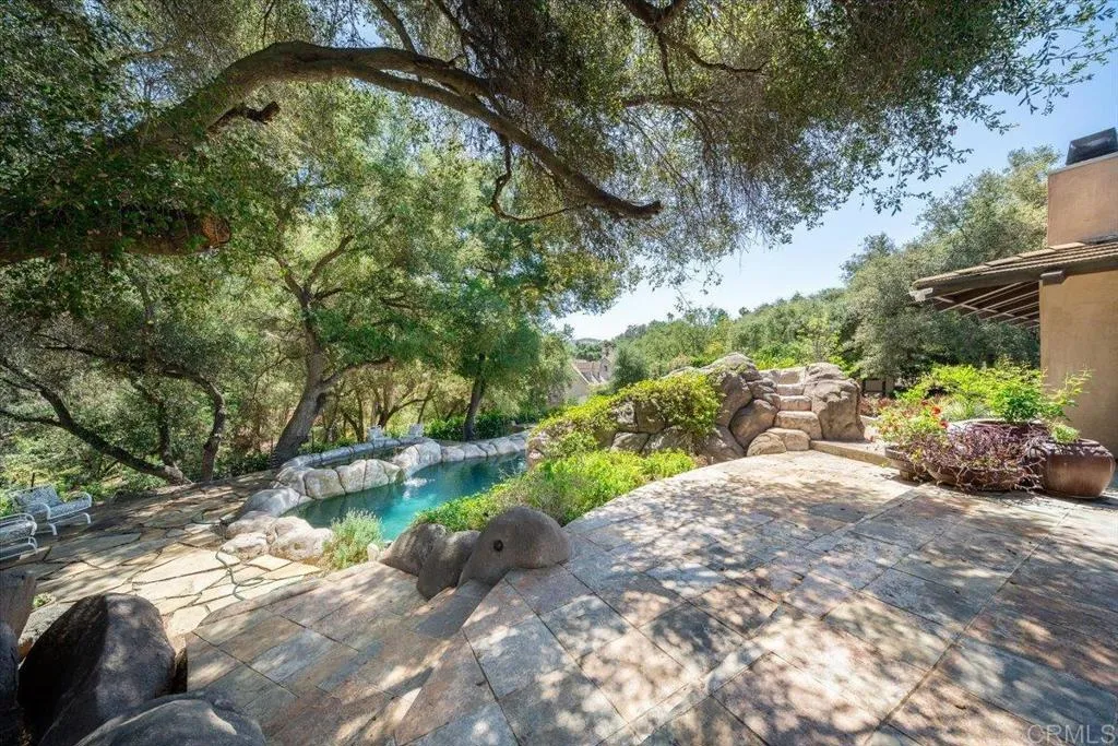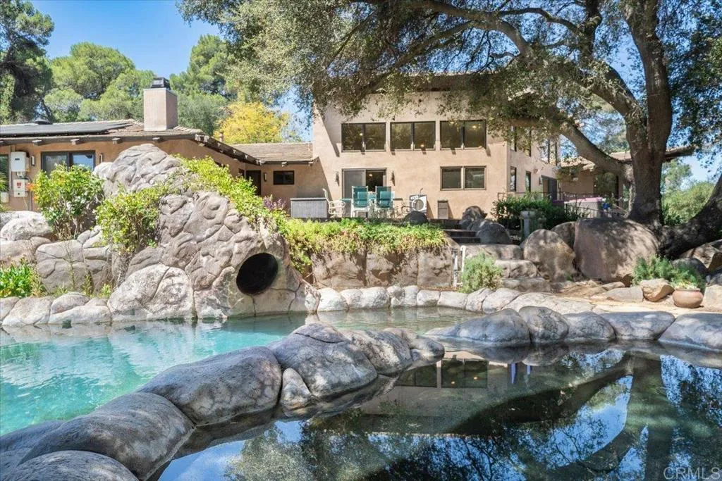 Tucked within the highly sought-after Green Valley community of Poway, this exceptional single-story estate offers a rare opportunity to own over two acres of private, park-like grounds in one of North Countys most desirable settings. Surrounded by mature trees, lush landscaping, and a natural creek that meanders through the property, the home evokes a serene, retreat-like atmospherereminiscent of living in your own private park or treehouse sanctuary. Spanning approximately 4,379 square feet, the residence is thoughtfully designed to maximize natural light and seamlessly connect indoor and outdoor living. Expansive windows, vaulted ceilings, and multiple sliding glass doors frame picturesque views from nearly every room, bringing the beauty of the outdoors inside. The flexible floor plan includes multiple living and entertaining spaces, highlighted by a spacious great room and an inviting kitchen designed for gathering. The property features 5 generously sized bedrooms, including a private primary suite with its own fireplace, and tranquil views of the surrounding landscape. An attached ADU with an additional bedroom and bath, provides added versatilityideal for multigenerational living, guests, or potential rental income. Outdoors, the grounds truly set this property apart. Enjoy a resort-style setting complete with a free-form pool and spa, expansive patios, and open lawn areasall framed by the peaceful presence of the creek and natural surroundings. Whether hosting gatherings or enjoying quiet moments in nature, the possibilities are endless. Set on over 2.18 acres, thi