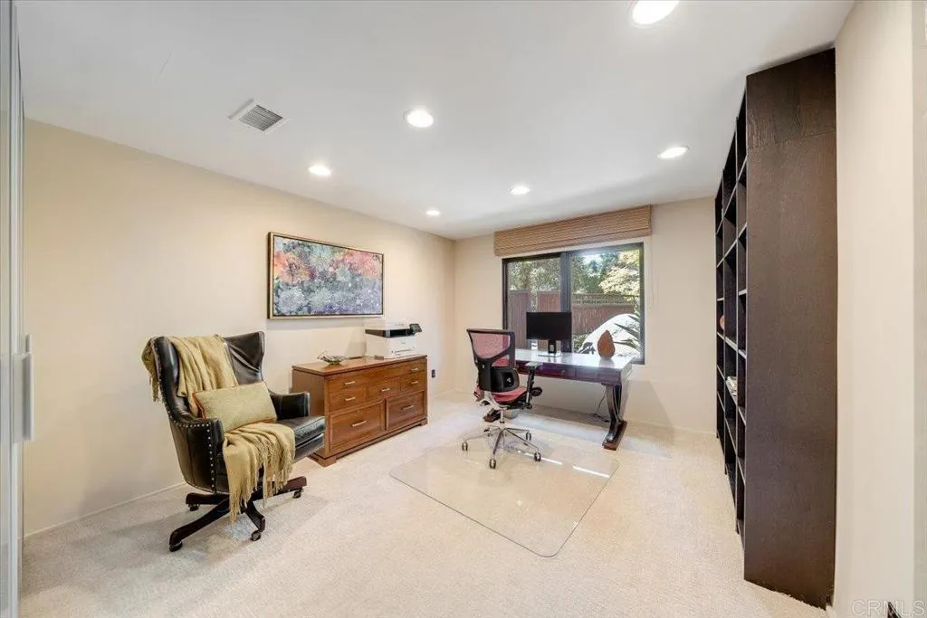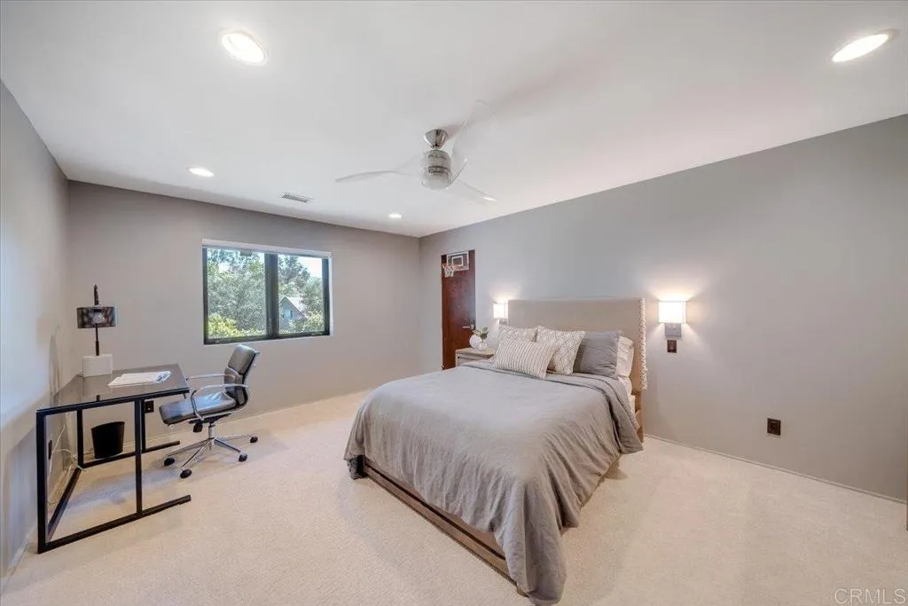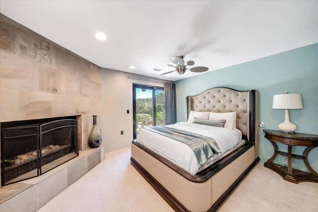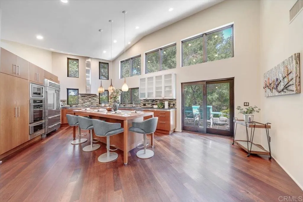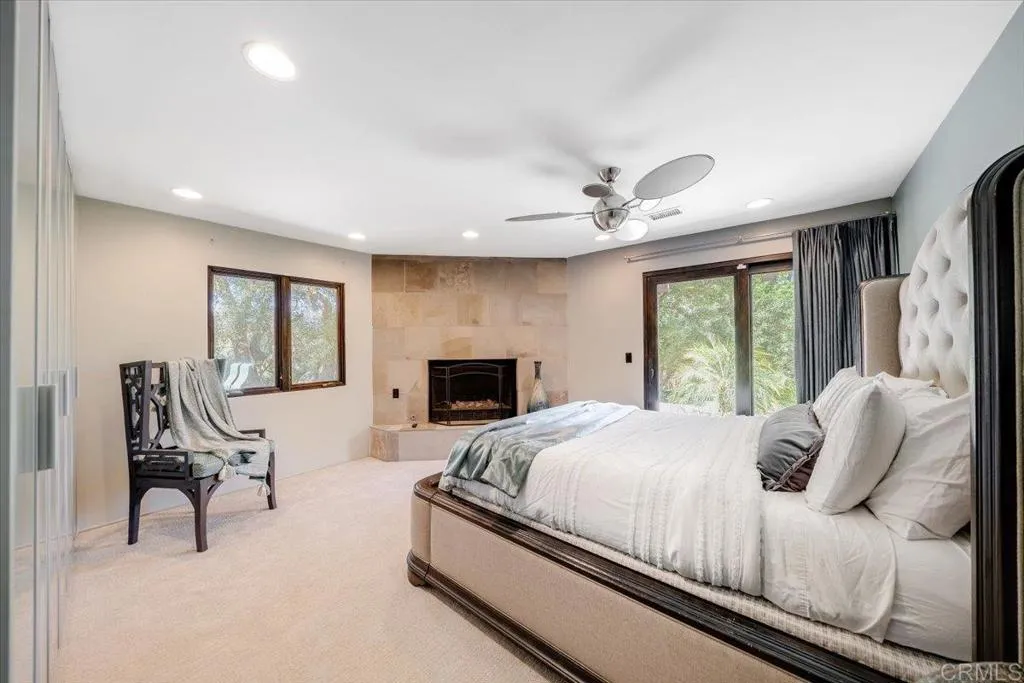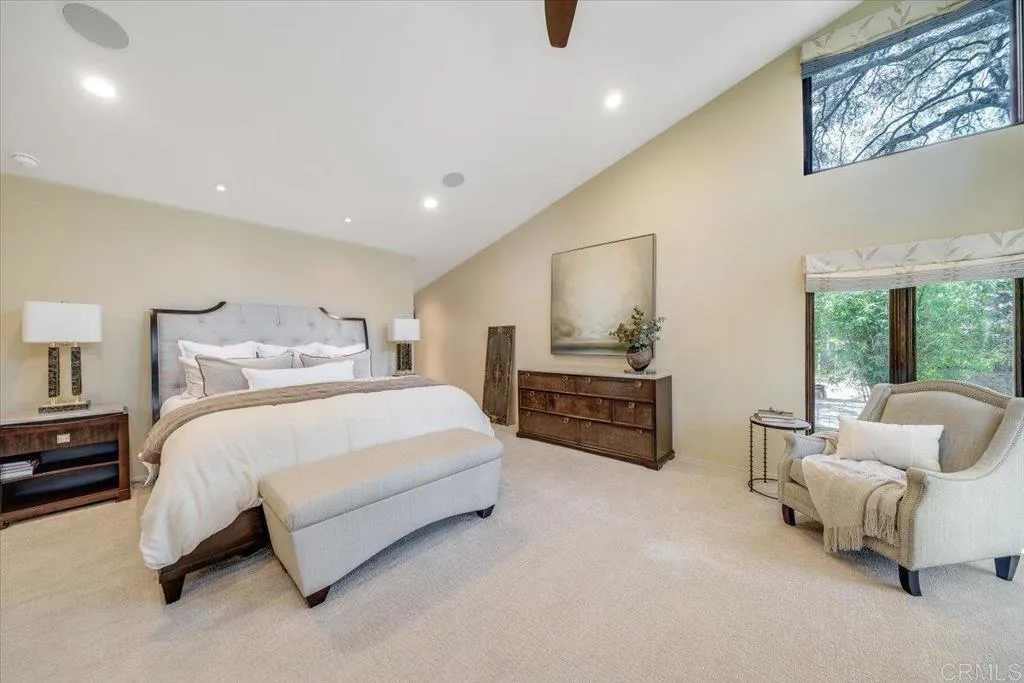 Tucked within the highly sought-after Green Valley community of Poway, this exceptional single-story estate offers a rare opportunity to own over two acres of private, park-like grounds in one of North Countys most desirable settings. Surrounded by mature trees, lush landscaping, and a natural creek that meanders through the property, the home evokes a serene, retreat-like atmospherereminiscent of living in your own private park or treehouse sanctuary. Spanning approximately 4,379 square feet, the residence is thoughtfully designed to maximize natural light and seamlessly connect indoor and outdoor living. Expansive windows, vaulted ceilings, and multiple sliding glass doors frame picturesque views from nearly every room, bringing the beauty of the outdoors inside. The flexible floor plan includes multiple living and entertaining spaces, highlighted by a spacious great room and an inviting kitchen designed for gathering. The property features 5 generously sized bedrooms, including a private primary suite with its own fireplace, and tranquil views of the surrounding landscape. An attached ADU with an additional bedroom and bath, provides added versatilityideal for multigenerational living, guests, or potential rental income. Outdoors, the grounds truly set this property apart. Enjoy a resort-style setting complete with a free-form pool and spa, expansive patios, and open lawn areasall framed by the peaceful presence of the creek and natural surroundings. Whether hosting gatherings or enjoying quiet moments in nature, the possibilities are endless. Set on over 2.18 acres, thi