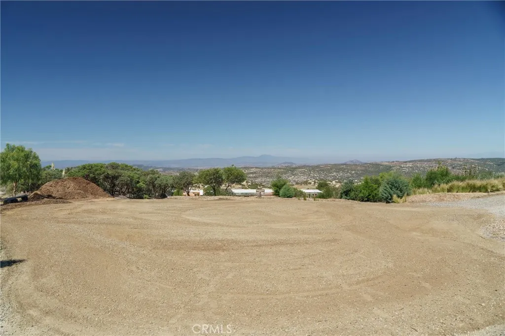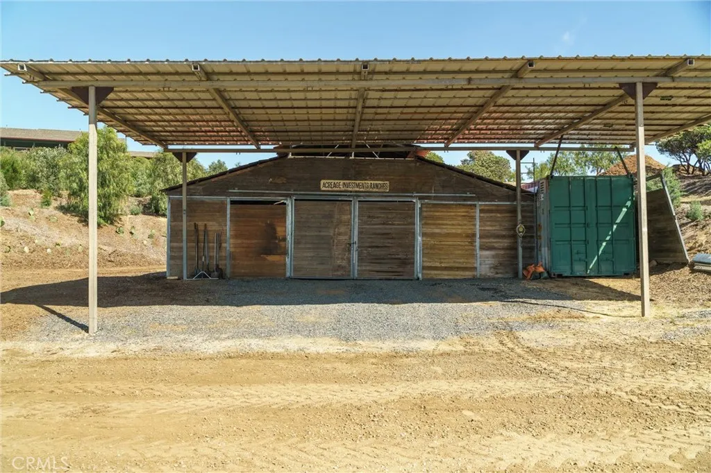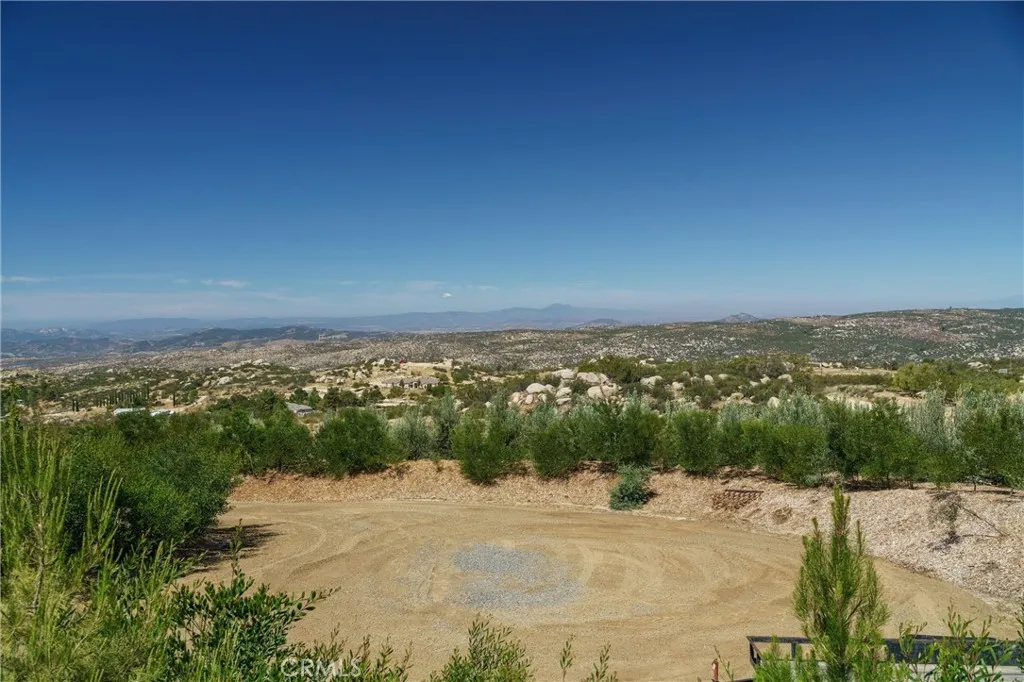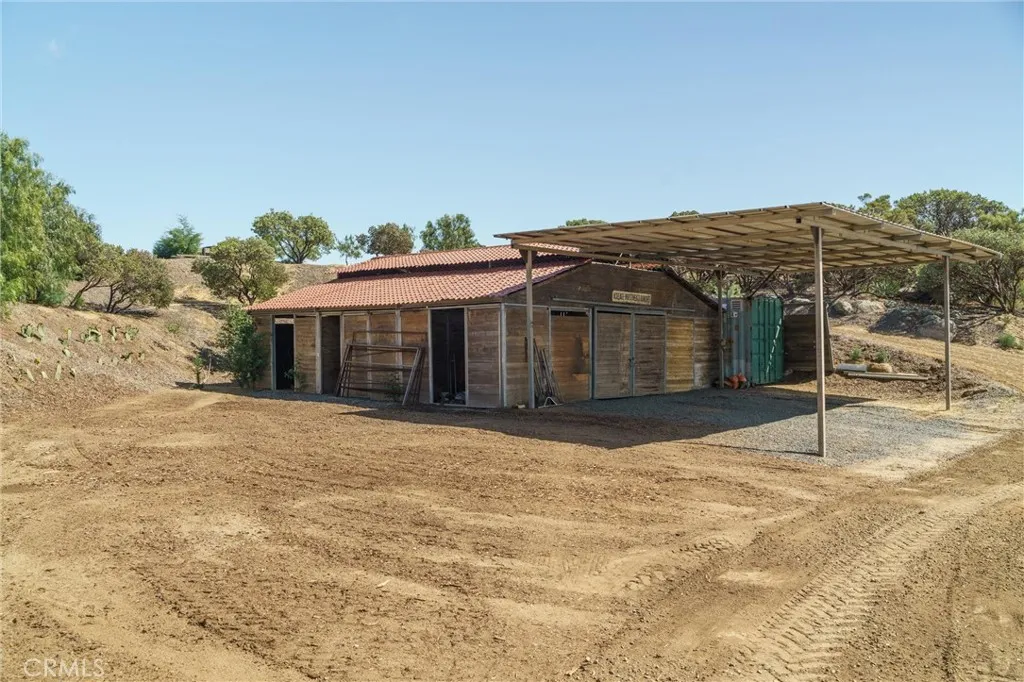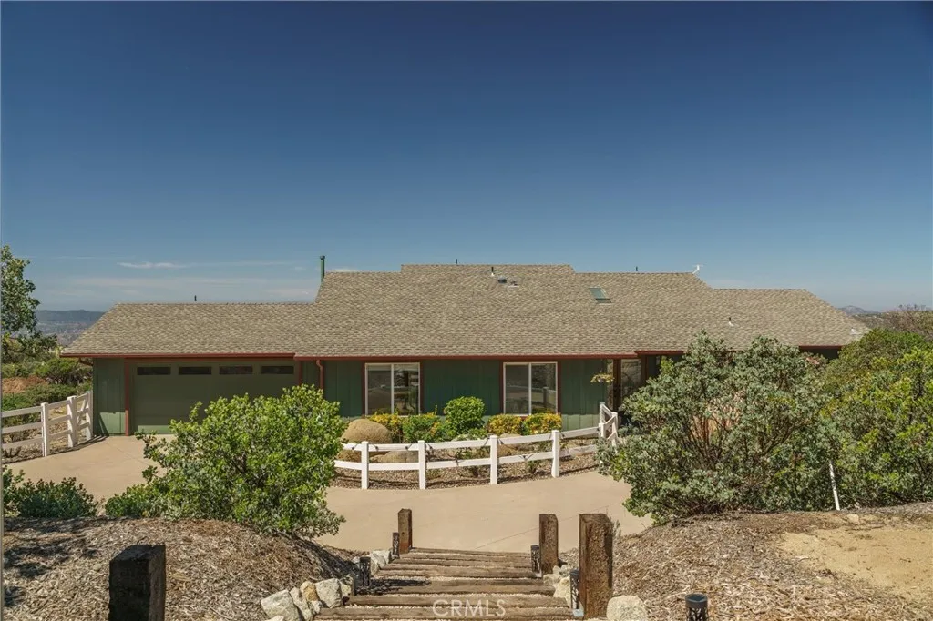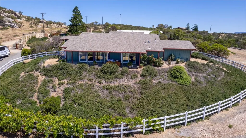 Discover this private home located at the top of Crazy Horse Canyon Drive in the Lake Riverside Estates community, offering sweeping 180 views extending 3040 miles across Palomar Mountain, Temecula, and Murrieta. This single-story 3-bedroom, 2-bath, 1,940 sq ft home sits on 2.73 fully landscaped acres with fully usable four-tiered space and two barns positioned on opposite ends of the property, including a 36'36' lower barn with breezeway, attached container storage, and 45'24'15' high-clearance covered parking, and a 12'24' upper horse barn with breezeway and 45'36'15' high-clearance covered parking suitable for RVs, trailers, or equipment. Inside, the open-concept layout connects the living room, dining area, and kitchen, creating a comfortable and functional living space. The great room includes a built-in buffet, entertainment center, and wine refrigerator. The kitchen features a central island and an adjacent pantry and laundry room with built-in shelving, office workspace, and a utility sink. An entry skylight above the front door and solar tubes in both bathrooms provide additional natural light. Four west-facing sliding glass doors frame the views and connect the home to the outdoor setting. The primary bedroom includes backyard access, a large walk-in closet, a 5'6' walk-in tiled shower with dual vanities, and a separate private toilet room with window. The fully covered rear patio provides a relaxing outdoor setting with some of the best views in the community. The immediate backyard area is fenced for pets. The landscaped property includes approximately 300 trees