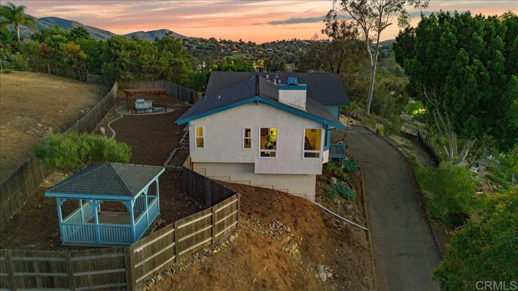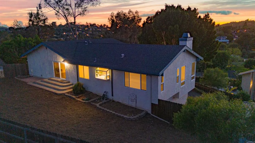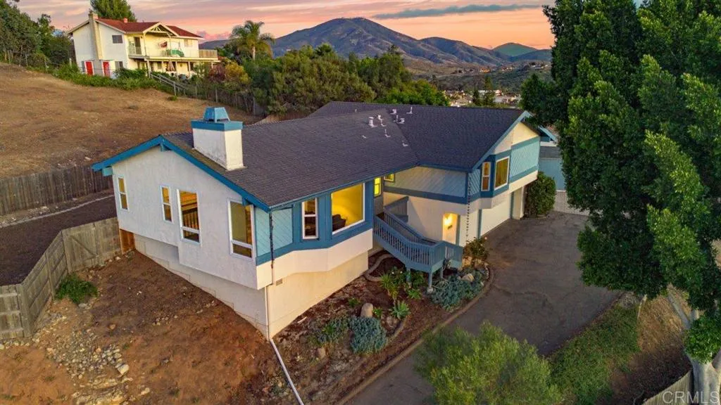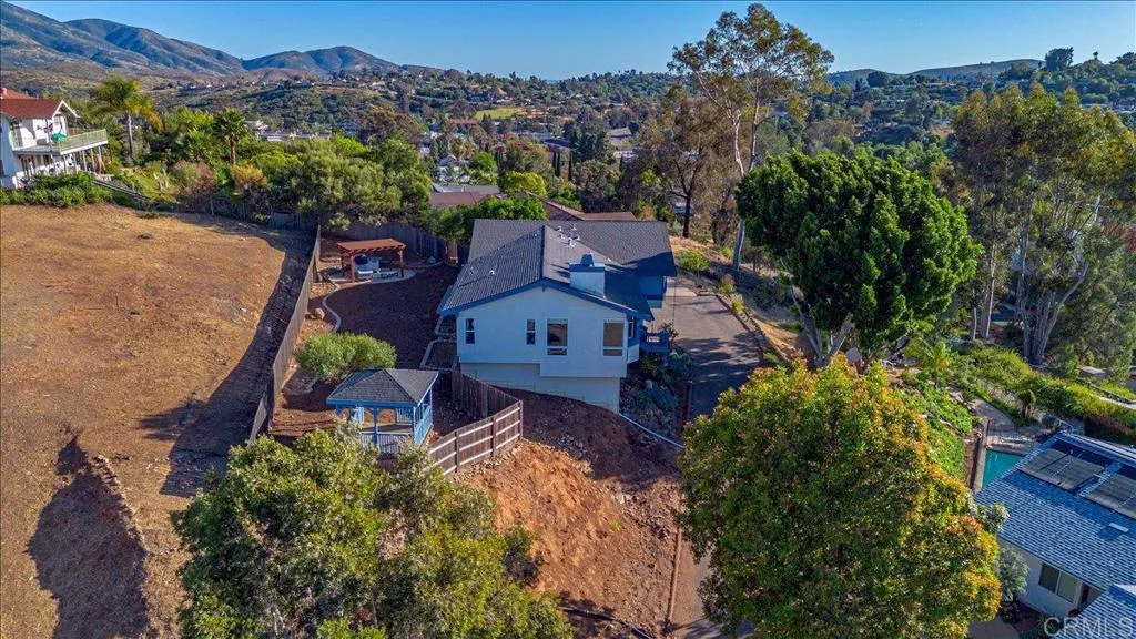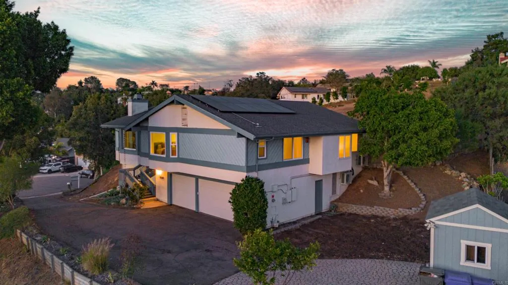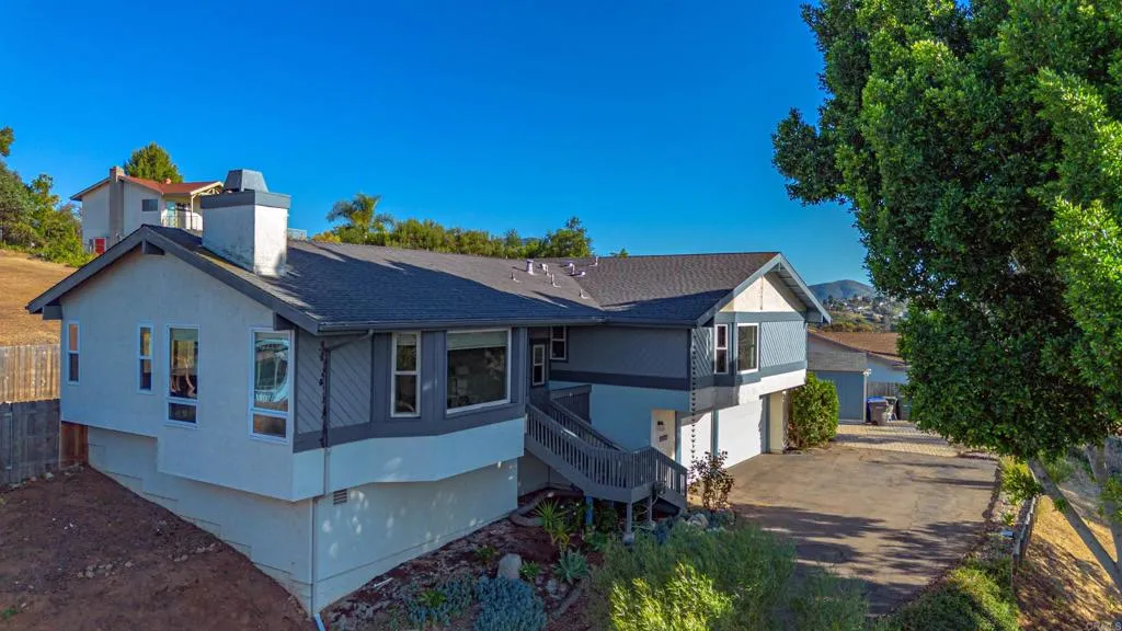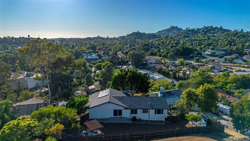 Mt. Helix foothills retreat situated at the crest of a private cul-de-sac. This bright and airy split-level California contemporary features 4BR, 3BA, a 3-car garage, and stunning views from nearly every room. The primary suite offers a massive walk-in closet, while the living room boasts vaulted ceilings and a floor-to-ceiling stone fireplace. Maximize comfort and efficiency with fully owned solar, Tesla Powerwall, EV charging, dual-pane windows, and individual mini-split HVAC units in every room. Move-in ready with new luxury vinyl plank flooring, fresh paint, and a new refrigerator, washer, and dryer. The .37-acre lot includes a gazebo, built-in BBQ, and storage shed with ample space for your custom landscaping vision. Experience hilltop serenity just minutes from schools, dog park, shopping, and dining.