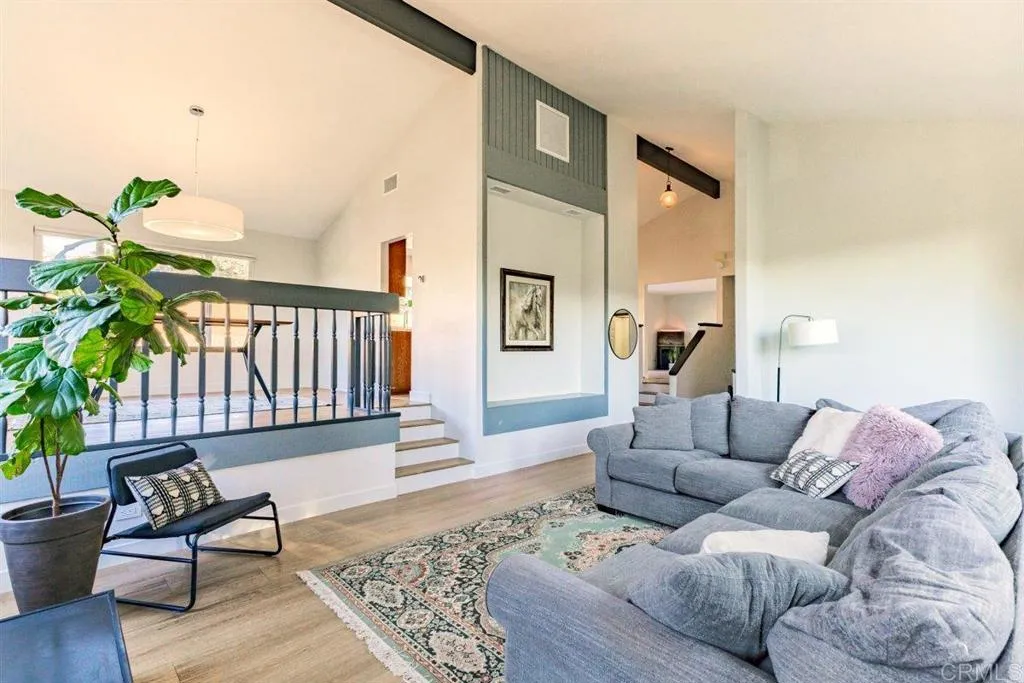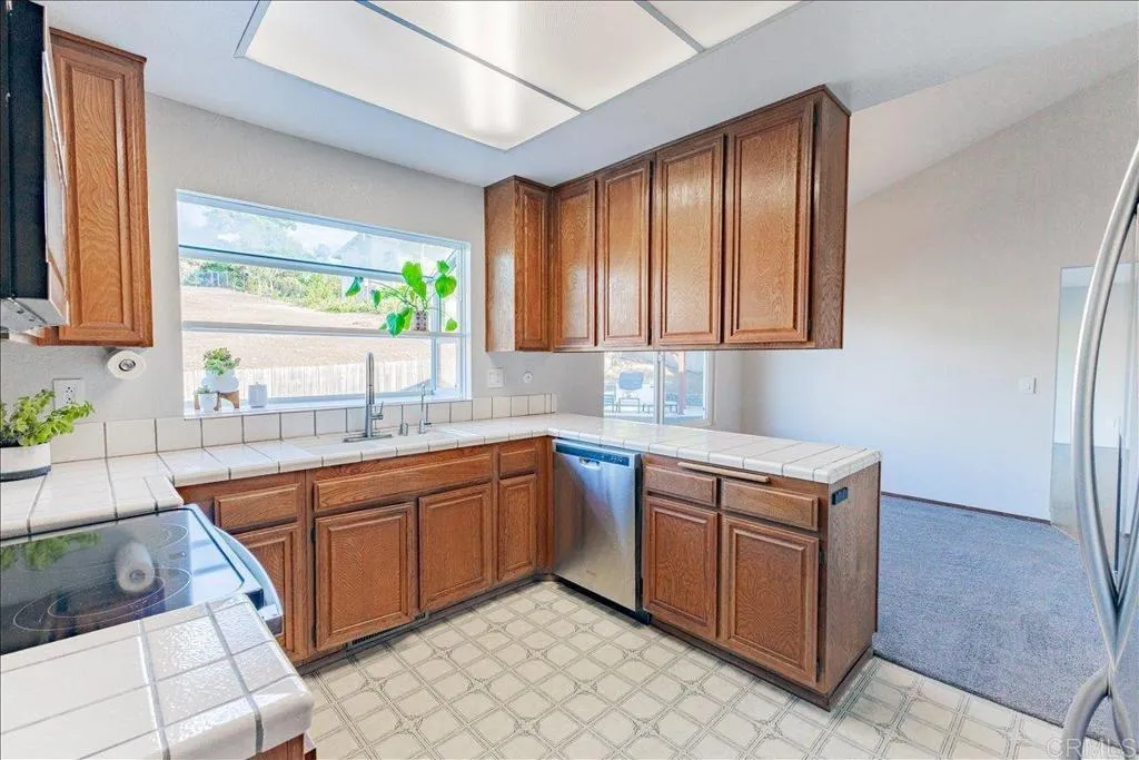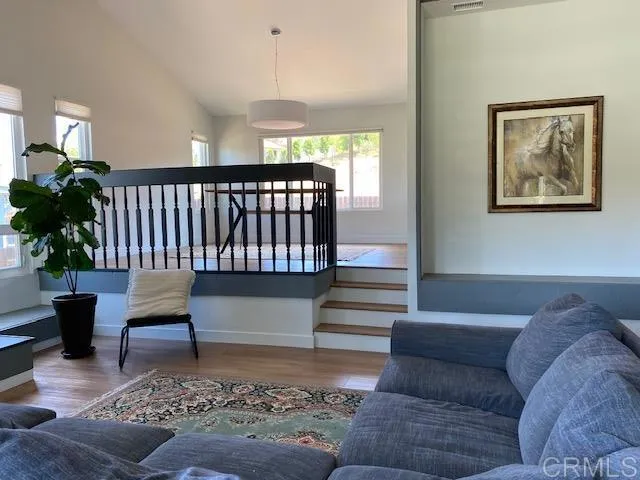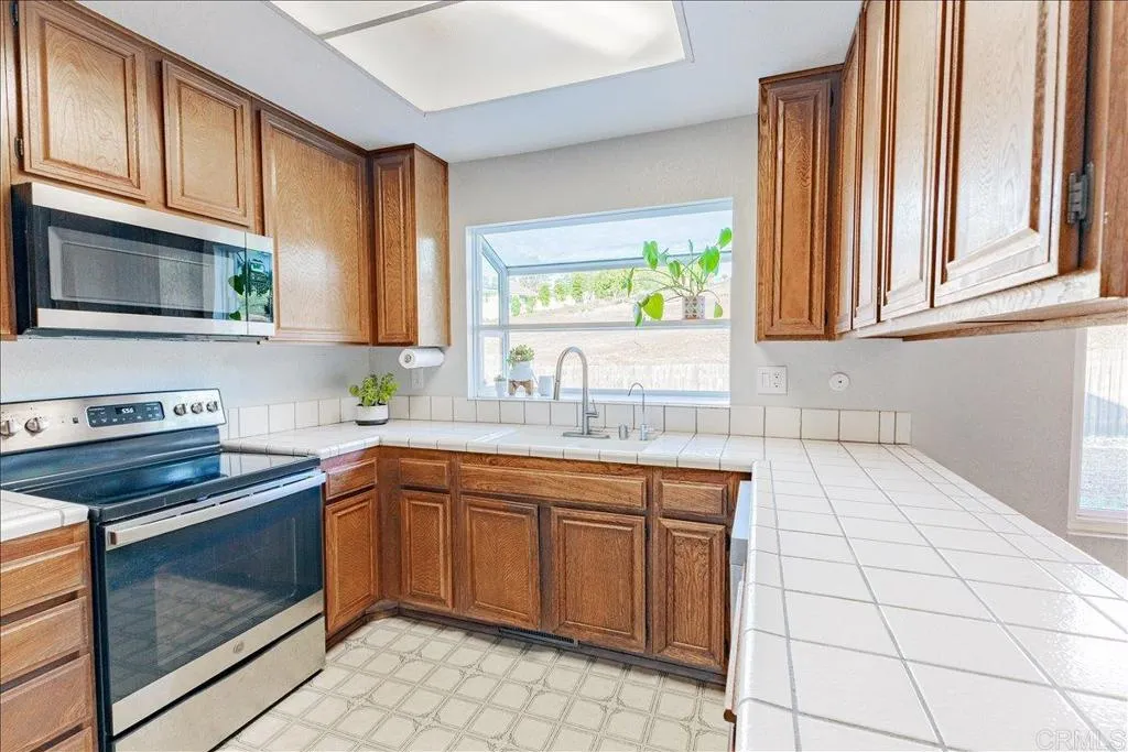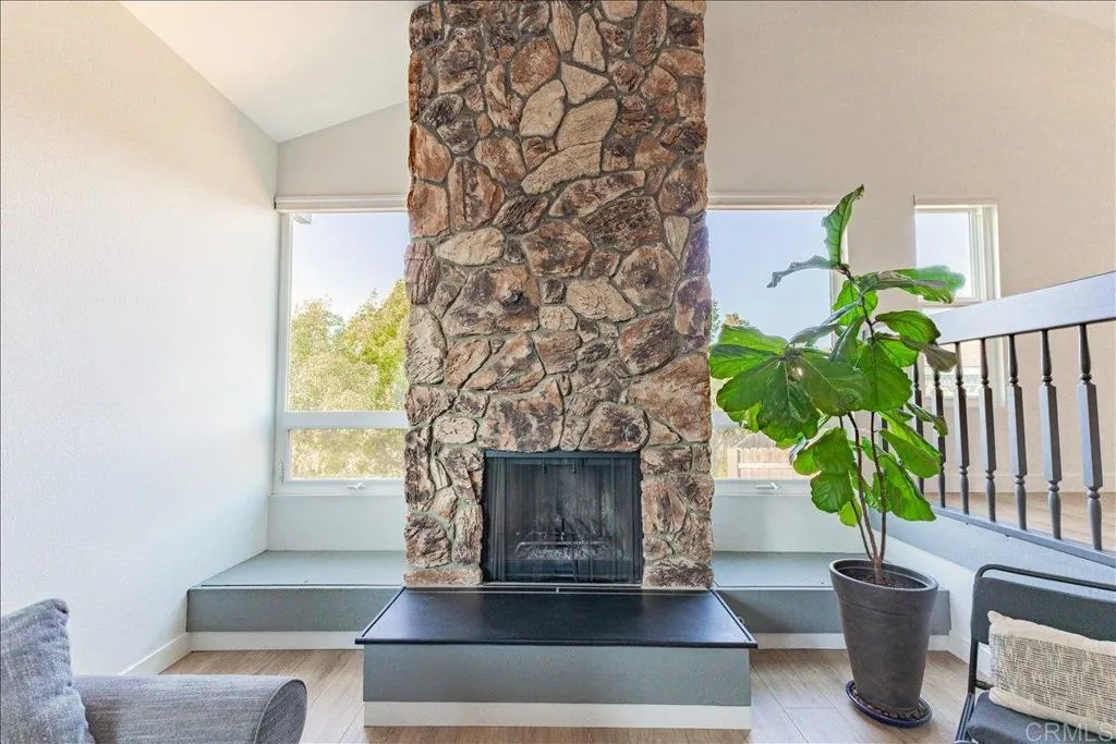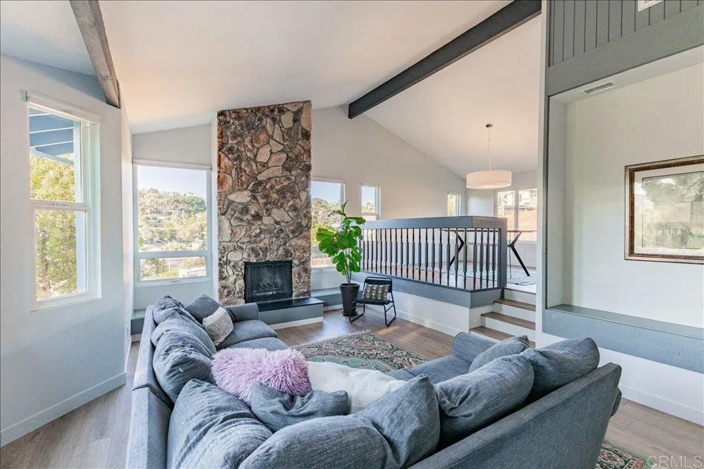 Mt. Helix foothills retreat situated at the crest of a private cul-de-sac. This bright and airy split-level California contemporary features 4BR, 3BA, a 3-car garage, and stunning views from nearly every room. The primary suite offers a massive walk-in closet, while the living room boasts vaulted ceilings and a floor-to-ceiling stone fireplace. Maximize comfort and efficiency with fully owned solar, Tesla Powerwall, EV charging, dual-pane windows, and individual mini-split HVAC units in every room. Move-in ready with new luxury vinyl plank flooring, fresh paint, and a new refrigerator, washer, and dryer. The .37-acre lot includes a gazebo, built-in BBQ, and storage shed with ample space for your custom landscaping vision. Experience hilltop serenity just minutes from schools, dog park, shopping, and dining.