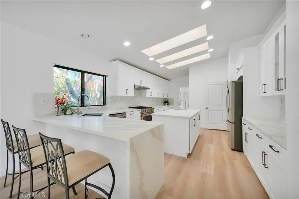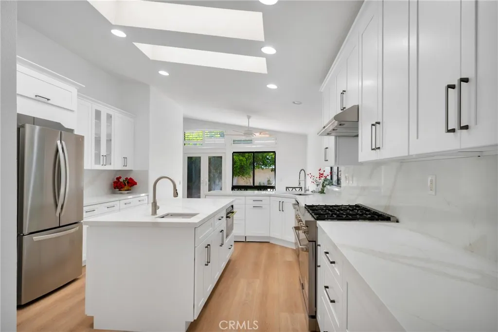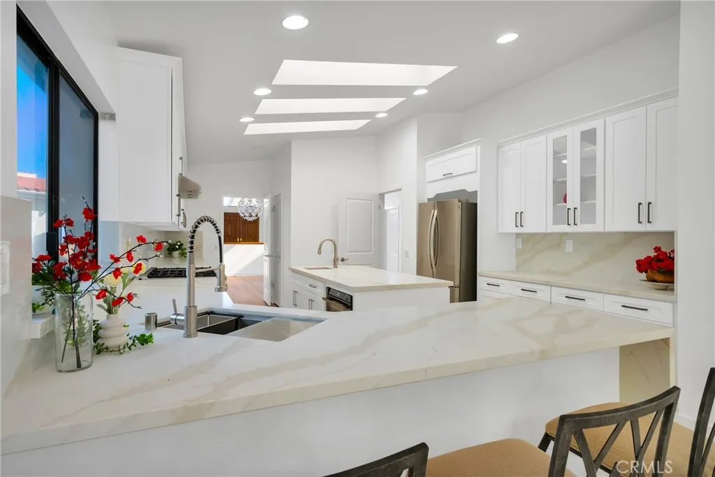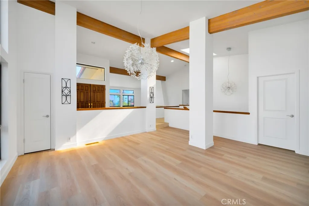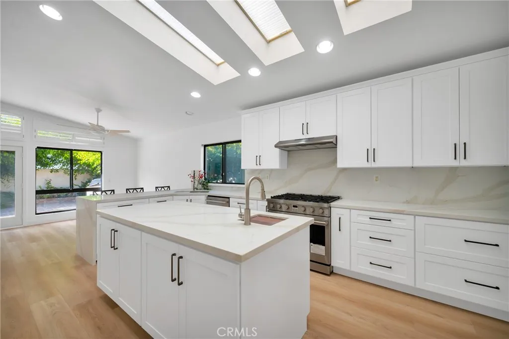 THERE'S SOMETHING SPECIAL ABOUT PULLING INTO A QUIET CUL-DE-SAC AND KNOWING YOU ARE HOME. Tucked within an exclusive private community in Rancho Palos Verdes, this expansive, light-filled residence offers the rare combination of space, privacy, and an effortlessly elevated lifestyle. Soaring ceilings and multiple skylights pour natural light into every corner, while three fireplaces- in the living room, family room, and primary suite give the home a warmth that makes it just as comfortable on a quiet evening as it is when you're hosting a crowd and a conveniently located powder room serves the main living areas with ease. The fully remodeled chef's kitchen is the heart of the home, featuring brand-new high-end appliances, custom cabinetry, stunning quartz countertops, and a showstopping waterfall-edge island. New flooring runs throughout and a large pantry keeps everything neatly organized. Whether you're doing a casual breakfast in the kitchen nook or hosting a formal dinner in the dining room, this home handles both without missing a beat. The oversized family room is genuinely impressive-easily large enough for a dedicated sitting area and/or a game room. It opens directly to a low-maintenance patio where the coastal breeze does most of the work. The home offers 4 en-suite bedrooms thoughtfully spread across two levels. Upstairs lives like a true single-level home, anchored by a generous primary suite with ocean and Catalina views, plus two additional bedrooms. A private lower-level suite is ideal for guests, multigenerational living, a home office, or a creative retreat