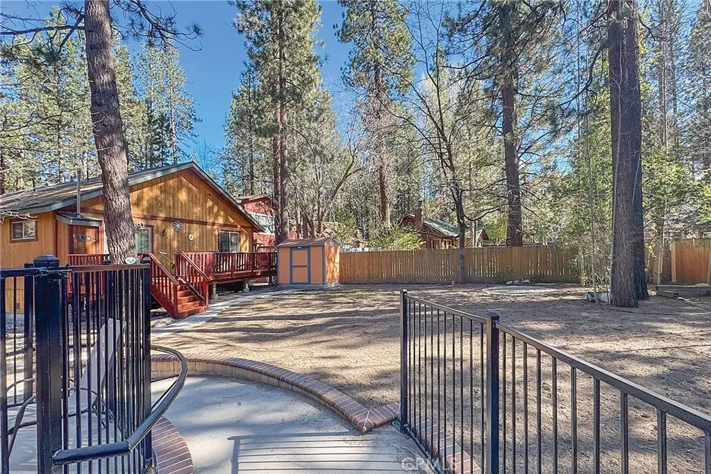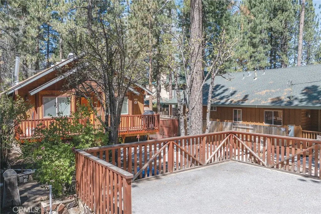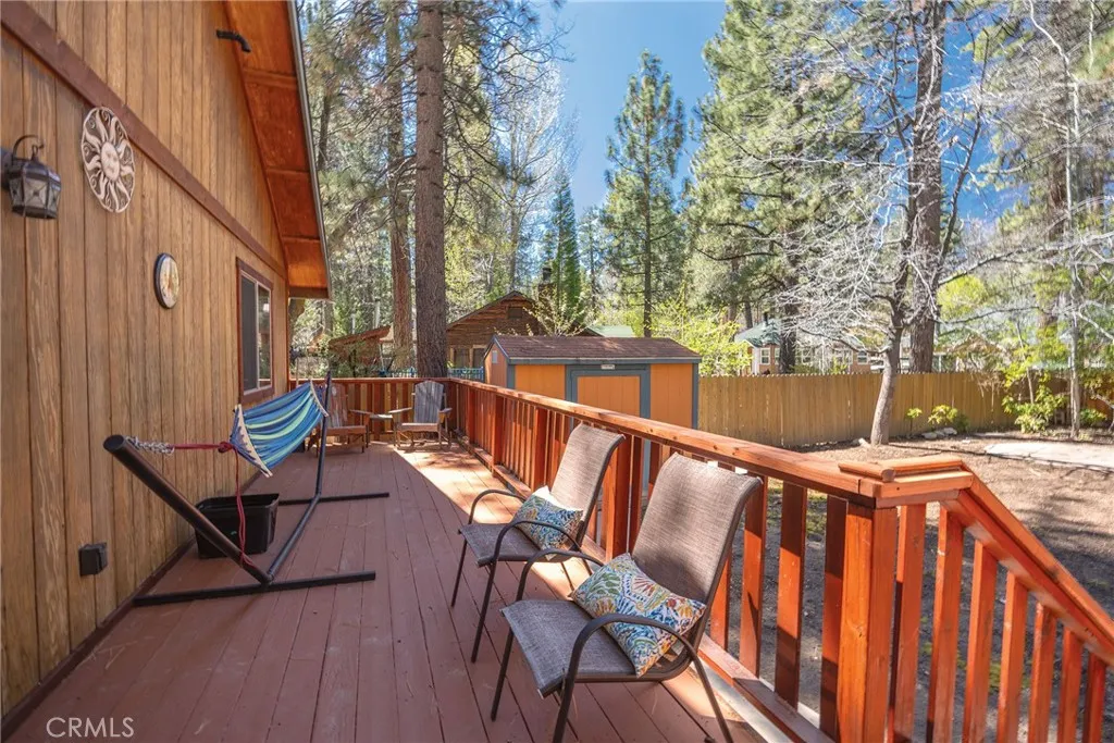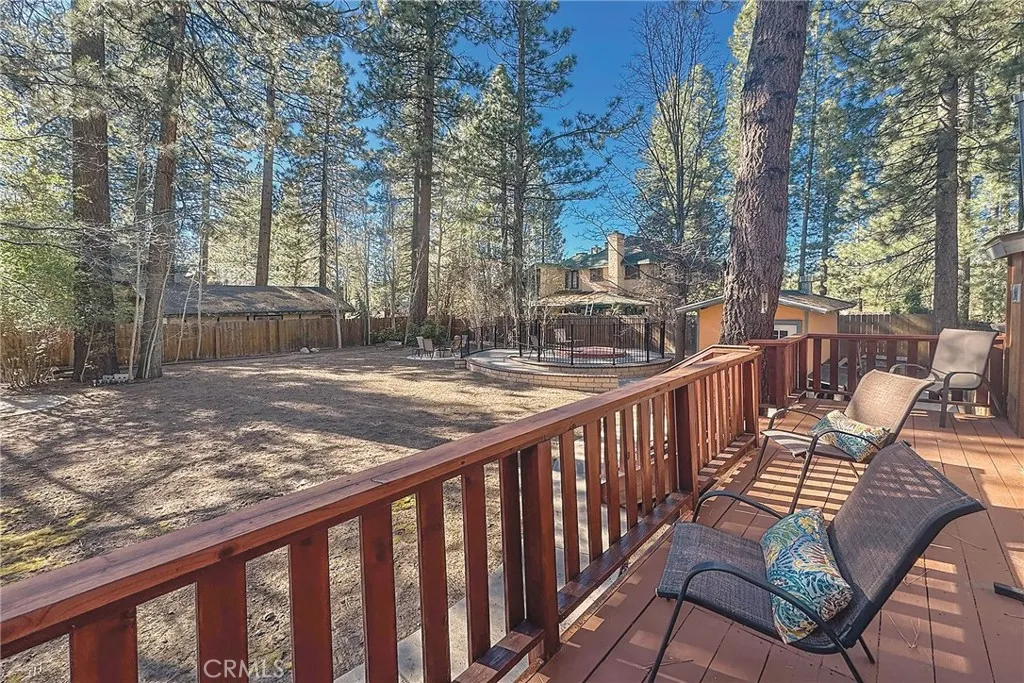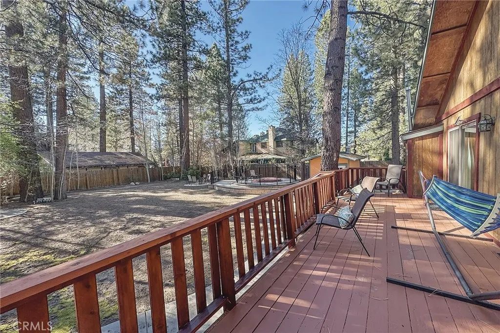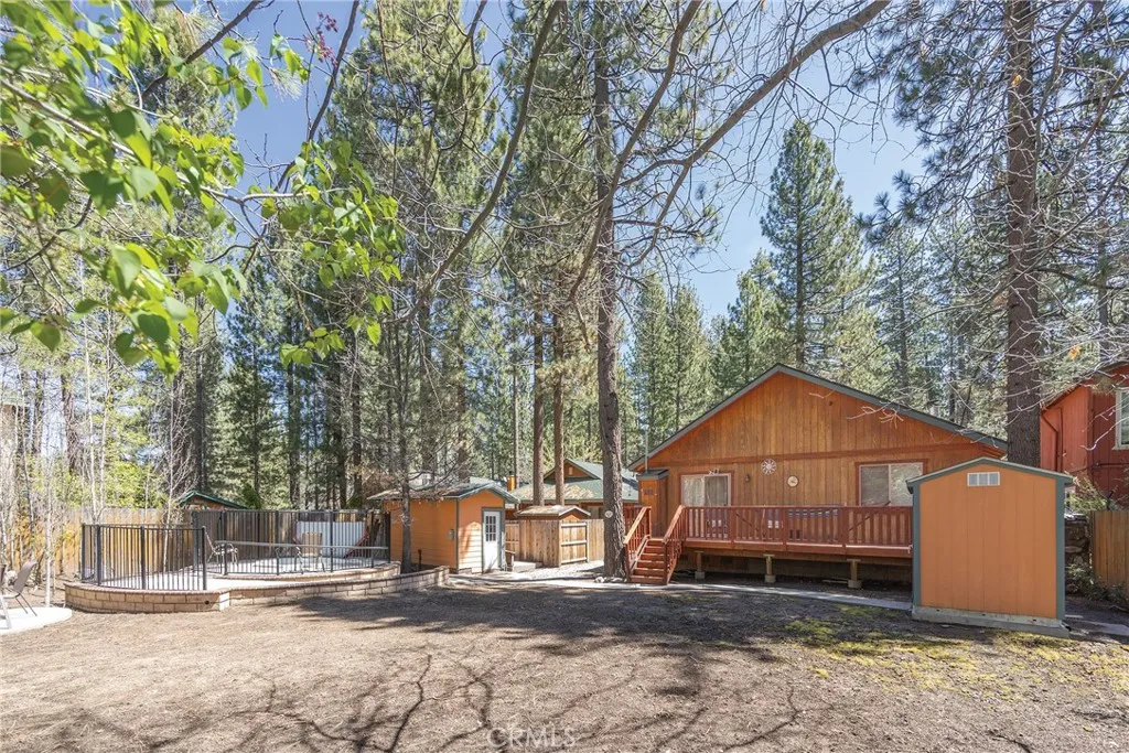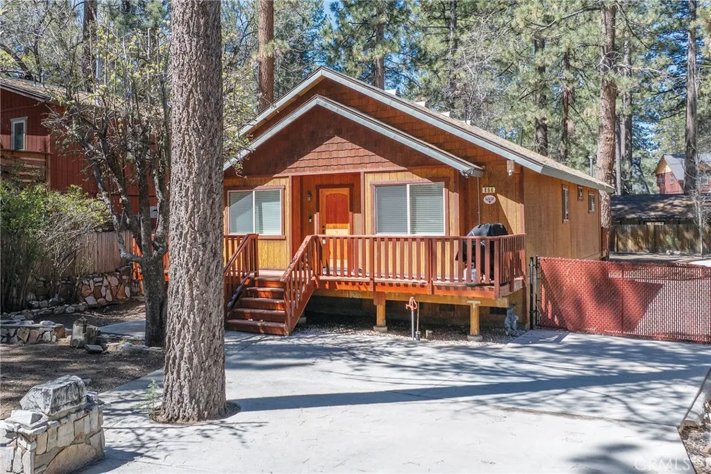 This inviting 1,360 sq ft single-story Big Bear Lake home sets the stage for days that begin with adventure & end with connectionLake Time, first tracks on the slopes, & evenings that draw everyone back together. Set on an expansive 11,000+ sq ft, 150' deep llot, thfe hard-to-find fenced backyard offers space to spread out & enjoy being together, from kids & dogs playing to a fun game of horseshoes or soaking in the spa under Big Bears spectacular, star-filled night skies. The front deck welcomes you, while the rear deck extends the living space outdoors, creating moments to gather, relax & take in the setting. Inside, everything comes together in the bright, flowing Great Roomthe kitchen becomes the hub for cooking & catching up, people gathering at the dining bar as memorable meals are created, with fireside conversation, movies, & board games all part of one shared space. The kitchen features stainless appliances, granite counters, an expansive dining bar, & a pantry cabinet. Anchoring the space is the stacked-stone fireplace with a wood/stove insertso inviting on snowy evenings. The bedrooms offer comfortable spaces to step away & recharge, while one room adds a playful touch with bunk beds & trundleperfect for sleepovers, extra guests, or fun, memory-filled Big Bear nights. The primary suite offers dual sinks, a tub/shower combo with glass doors, & direct access to the rear deck & yard, creating a natural indoor-outdoor connection. Both bathrooms feature tub/shower combos, tumbled travertine vanity tops, & recent updates include fresh interior paint & newly stained dec