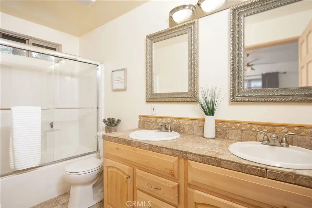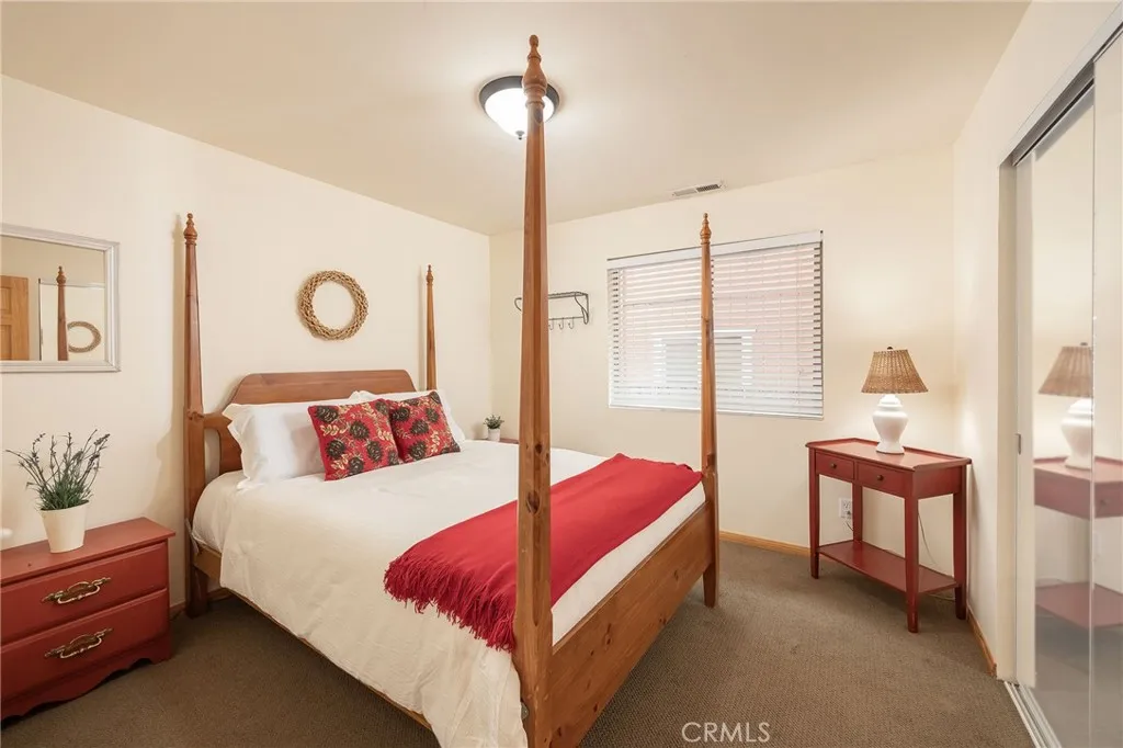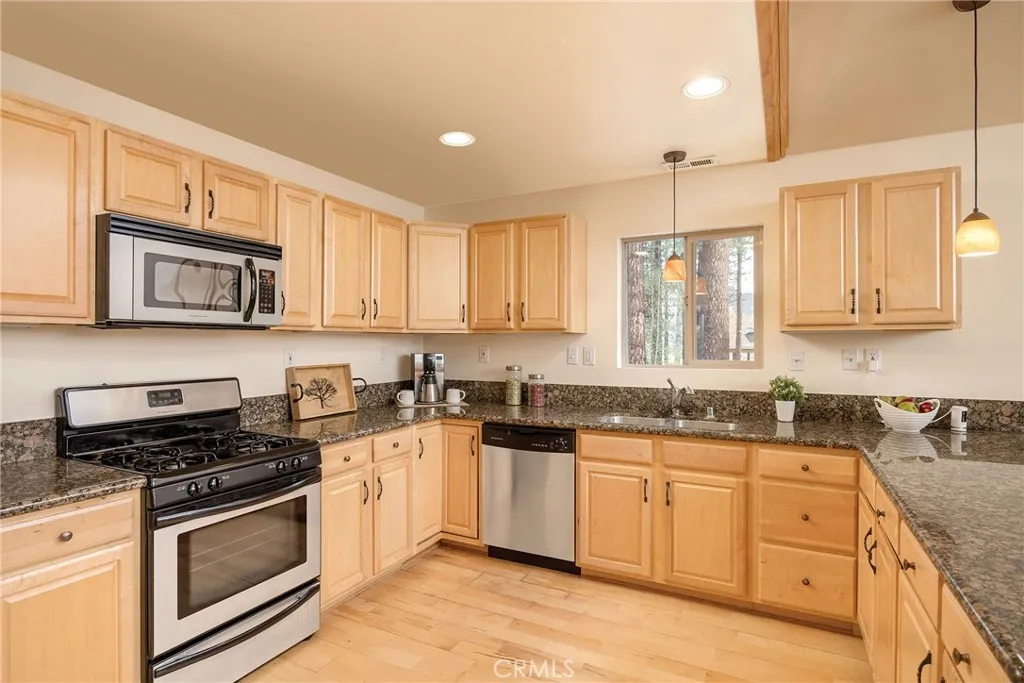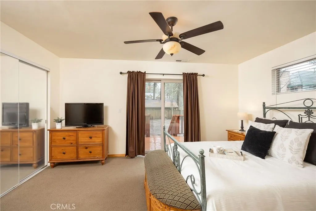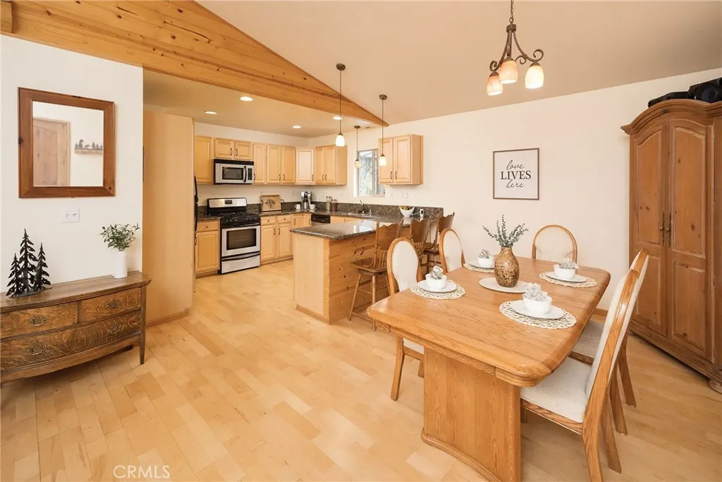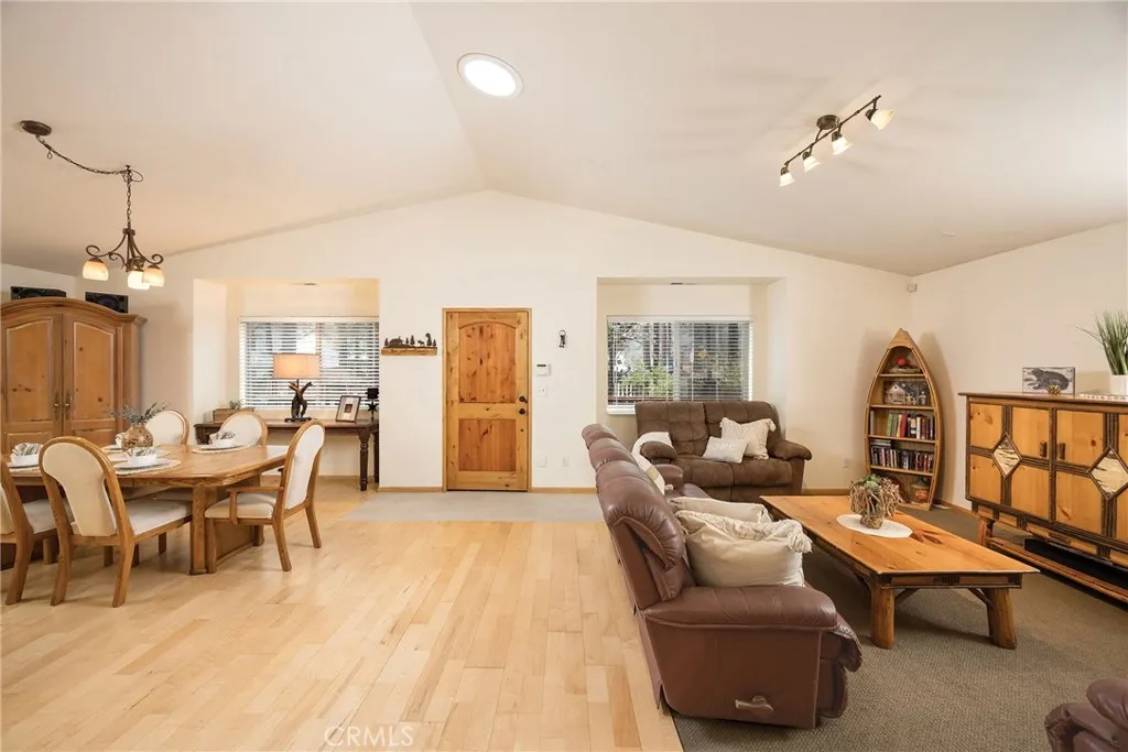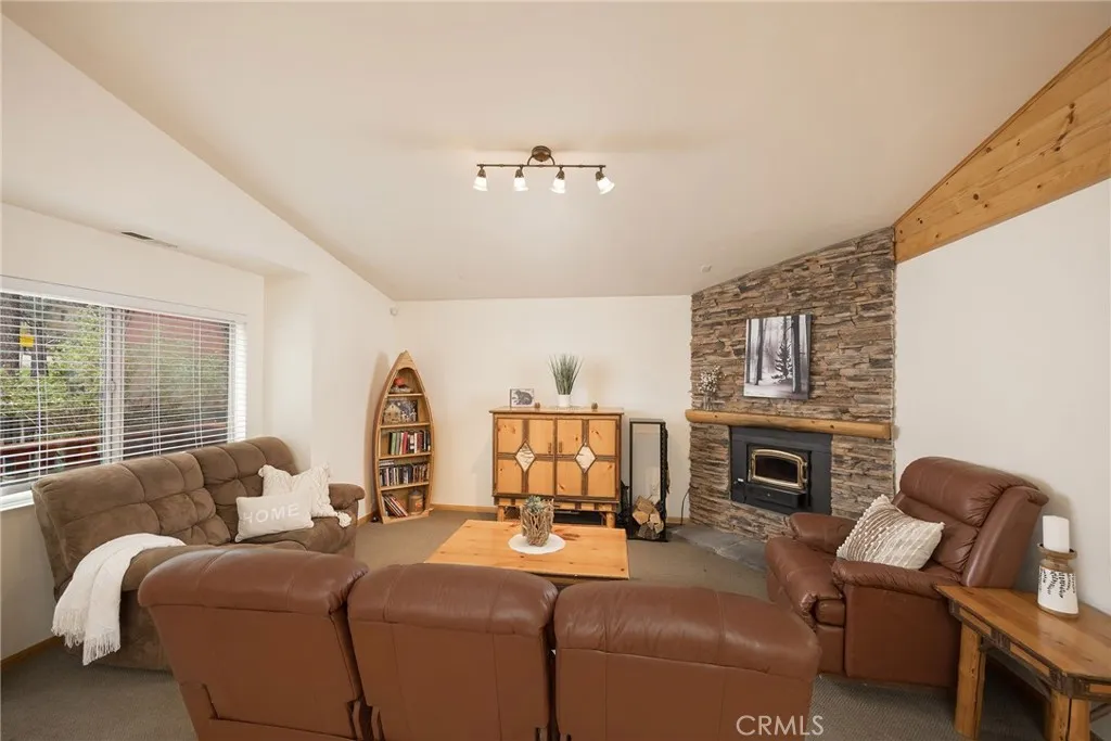 This inviting 1,360 sq ft single-story Big Bear Lake home sets the stage for days that begin with adventure & end with connectionLake Time, first tracks on the slopes, & evenings that draw everyone back together. Set on an expansive 11,000+ sq ft, 150' deep llot, thfe hard-to-find fenced backyard offers space to spread out & enjoy being together, from kids & dogs playing to a fun game of horseshoes or soaking in the spa under Big Bears spectacular, star-filled night skies. The front deck welcomes you, while the rear deck extends the living space outdoors, creating moments to gather, relax & take in the setting. Inside, everything comes together in the bright, flowing Great Roomthe kitchen becomes the hub for cooking & catching up, people gathering at the dining bar as memorable meals are created, with fireside conversation, movies, & board games all part of one shared space. The kitchen features stainless appliances, granite counters, an expansive dining bar, & a pantry cabinet. Anchoring the space is the stacked-stone fireplace with a wood/stove insertso inviting on snowy evenings. The bedrooms offer comfortable spaces to step away & recharge, while one room adds a playful touch with bunk beds & trundleperfect for sleepovers, extra guests, or fun, memory-filled Big Bear nights. The primary suite offers dual sinks, a tub/shower combo with glass doors, & direct access to the rear deck & yard, creating a natural indoor-outdoor connection. Both bathrooms feature tub/shower combos, tumbled travertine vanity tops, & recent updates include fresh interior paint & newly stained dec