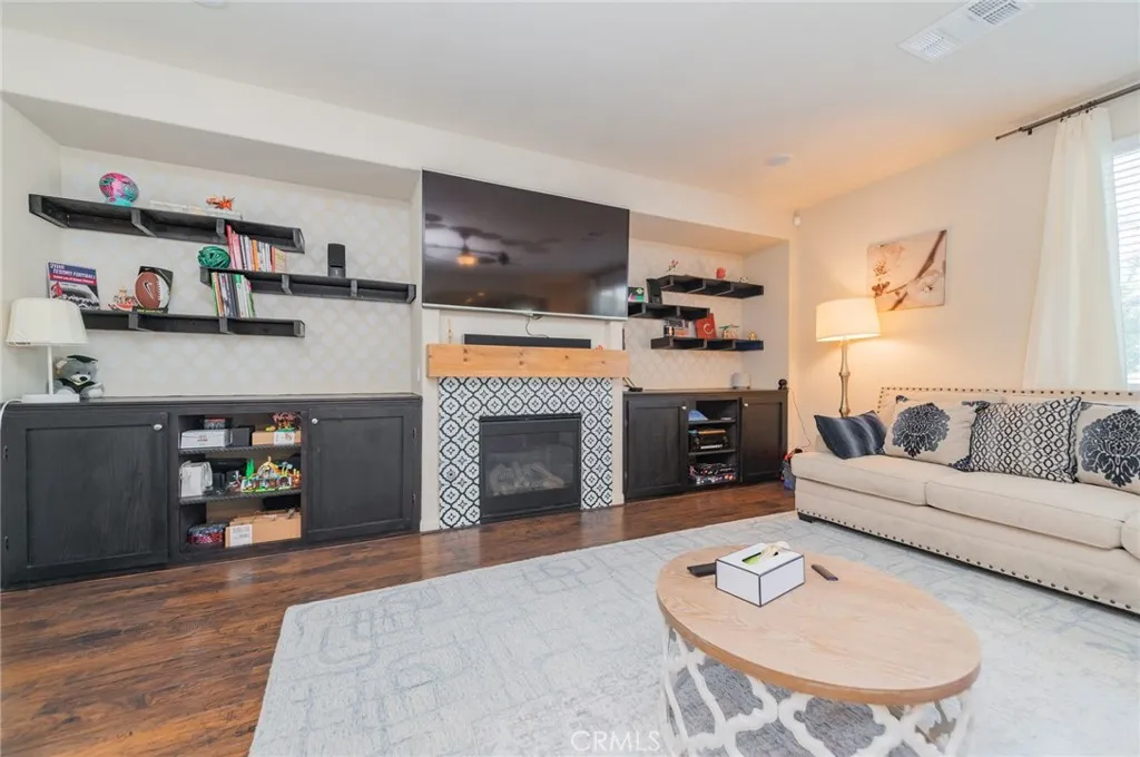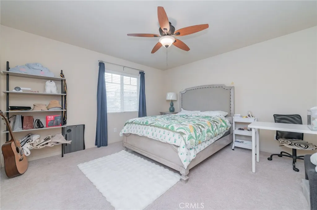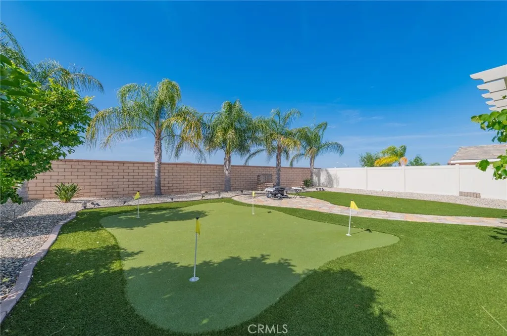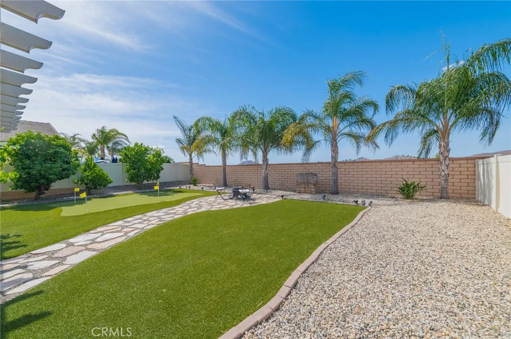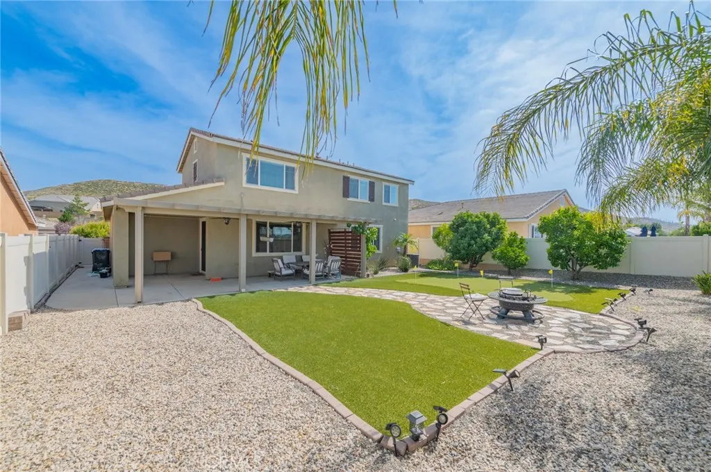 Former model home located at the end of a quiet cul-de-sac in Audie Murphy Ranch, Menifee, offering 5 bedrooms, 3 bathrooms, plus a bonus room office/den, with approximately 3,000 sq ft of upgraded living space on a 7,405 sq ft lot. The home features tall ceilings, fresh interior paint, and abundant natural light throughout. The main floor includes a flexible office/den space, a bedroom, and a full bathroom with tub/shower combo and custom barn door, ideal for guests or multigenerational living. The family room is appointed with laminate flooring, a custom fireplace with wood mantel, built-ins, and designer finishes. The open-concept kitchen boasts a large quartz island, extensive cabinetry, stainless steel appliances, a dining nook, walk-in pantry, and mudroom with direct access to the 3-car garage. Upstairs offers three spacious secondary bedrooms with mountain views and ceiling fans, a full secondary bathroom, and a dedicated laundry room with sink and storage. The primary suite features scenic mountain views, dual walk-in closets, dual vanities, a soaking tub, and separate shower. Additional upgrades include ceiling fans throughout, dimmer switches, motion-sensor lighting in bathrooms, and ample built-in and attic storage. The backyard offers privacy with no rear neighbors and is designed for entertaining, featuring a California room, Alumawood patio cover, flagstone hardscape, turf, fruit trees, and a private putting green, with plenty of space for a pool. Community amenities include pool, spa, sports courts, and clubhouse, with convenient access to the 15 and 215 free
