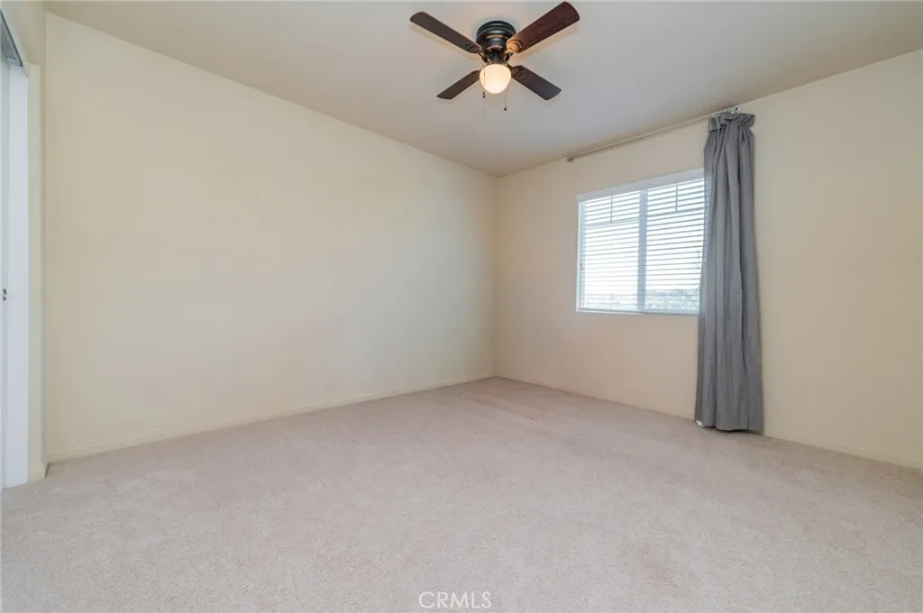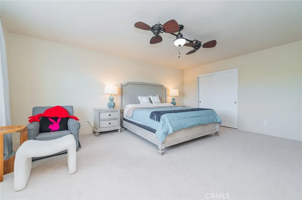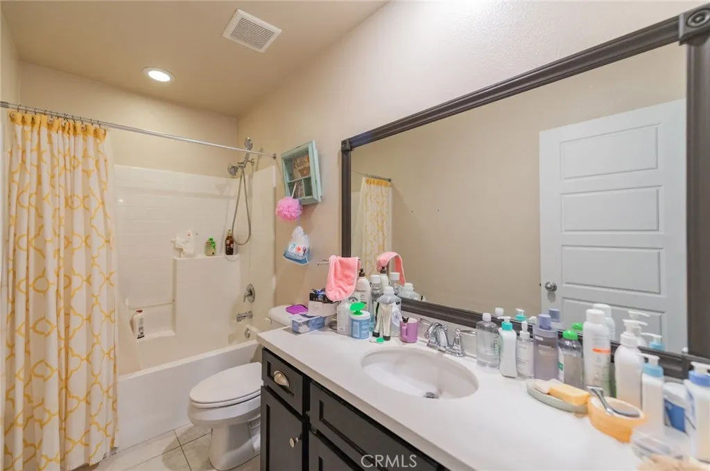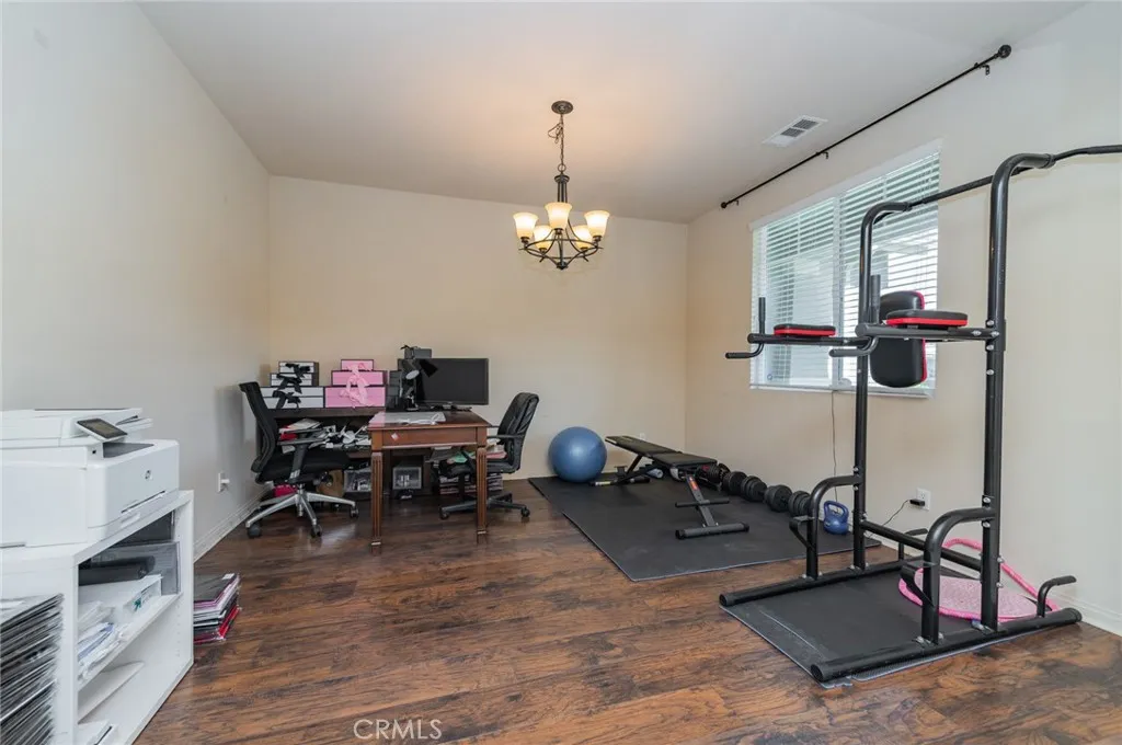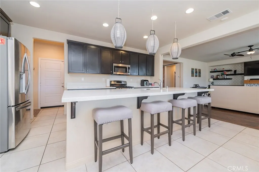 Former model home located at the end of a quiet cul-de-sac in Audie Murphy Ranch, Menifee, offering 5 bedrooms, 3 bathrooms, plus a bonus room office/den, with approximately 3,000 sq ft of upgraded living space on a 7,405 sq ft lot. The home features tall ceilings, fresh interior paint, and abundant natural light throughout. The main floor includes a flexible office/den space, a bedroom, and a full bathroom with tub/shower combo and custom barn door, ideal for guests or multigenerational living. The family room is appointed with laminate flooring, a custom fireplace with wood mantel, built-ins, and designer finishes. The open-concept kitchen boasts a large quartz island, extensive cabinetry, stainless steel appliances, a dining nook, walk-in pantry, and mudroom with direct access to the 3-car garage. Upstairs offers three spacious secondary bedrooms with mountain views and ceiling fans, a full secondary bathroom, and a dedicated laundry room with sink and storage. The primary suite features scenic mountain views, dual walk-in closets, dual vanities, a soaking tub, and separate shower. Additional upgrades include ceiling fans throughout, dimmer switches, motion-sensor lighting in bathrooms, and ample built-in and attic storage. The backyard offers privacy with no rear neighbors and is designed for entertaining, featuring a California room, Alumawood patio cover, flagstone hardscape, turf, fruit trees, and a private putting green, with plenty of space for a pool. Community amenities include pool, spa, sports courts, and clubhouse, with convenient access to the 15 and 215 free