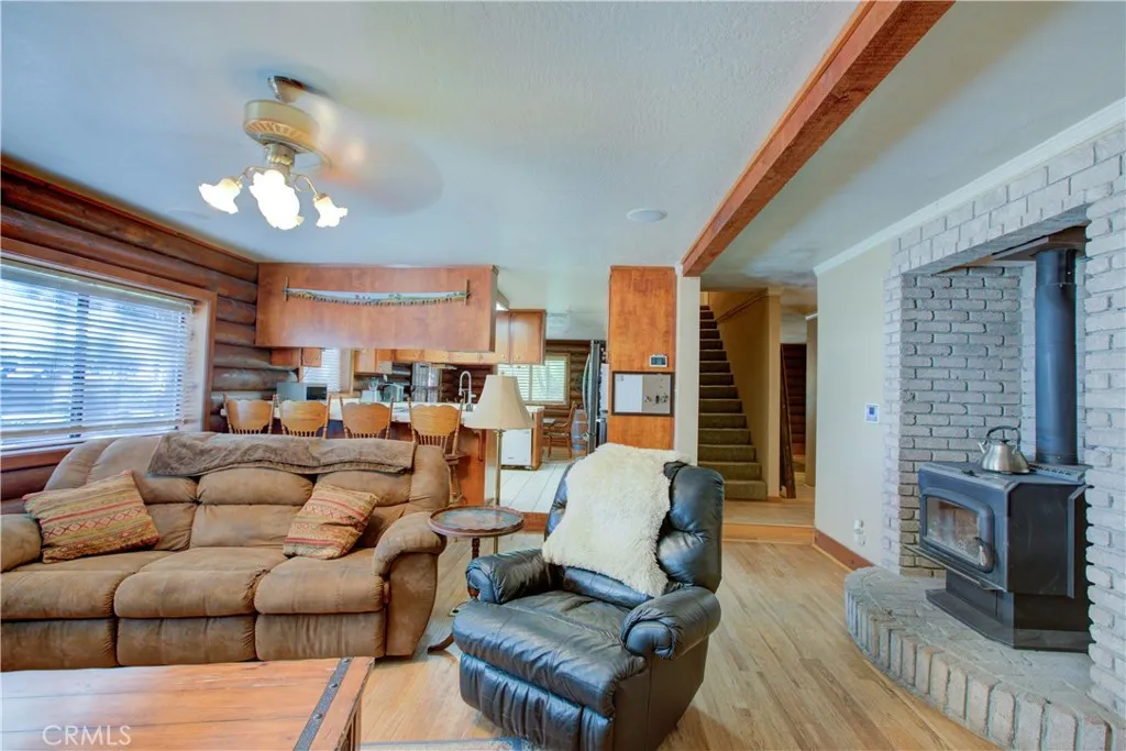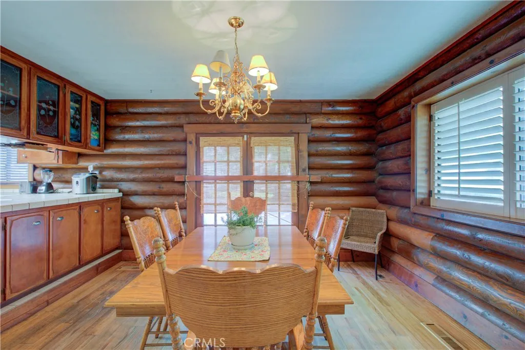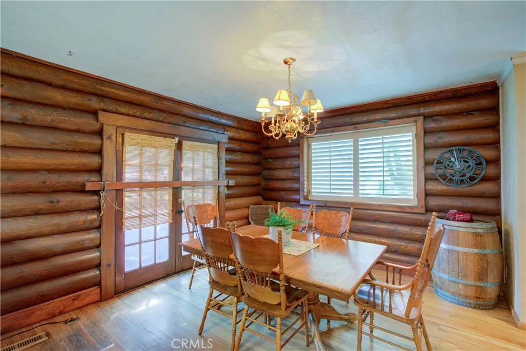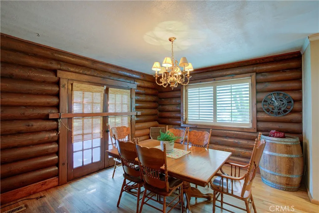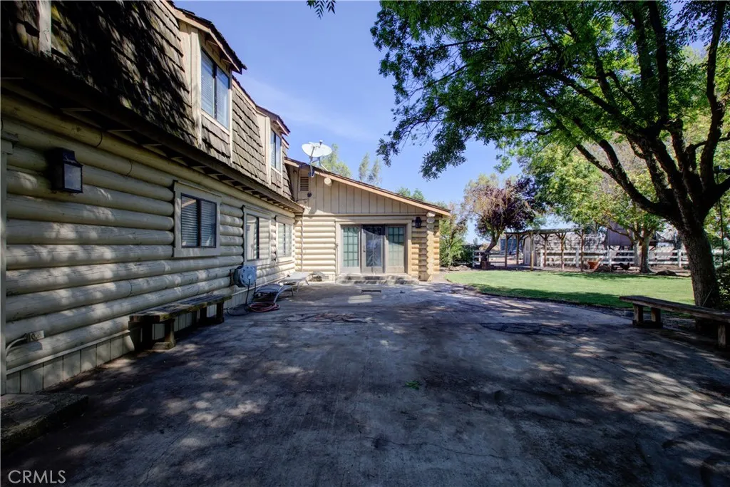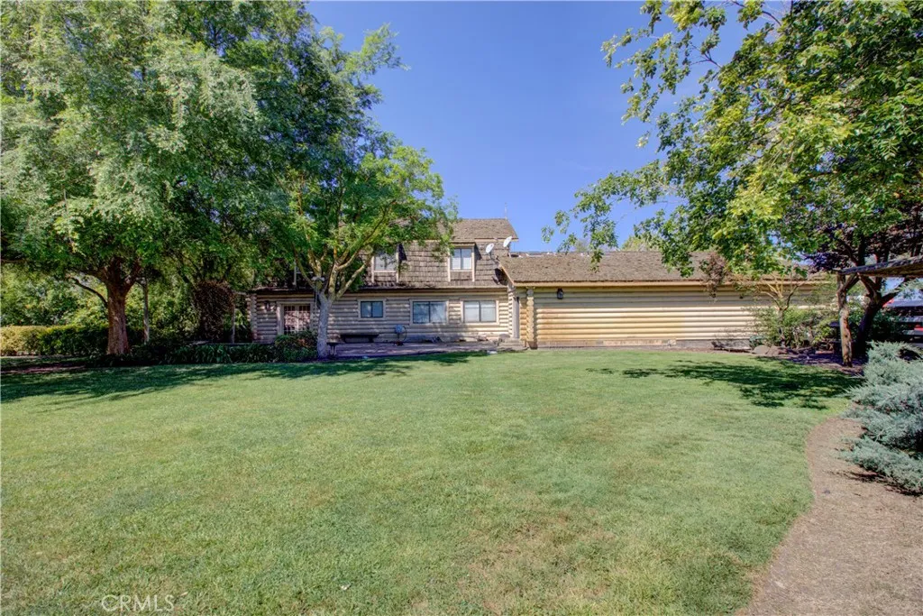 Spacious Ranch-Style Home on 2.6+ Acres with Dual Primary Suites! This custom two-story ranch-style home offers 4 bedrooms, 2.5 baths, and a thoughtfully designed layout. The home features a raised foundation, classic shake wood roof, and a 3-car garage, all complemented by mature landscaping, a lush lawn, and an efficient automatic sprinkler and drip system. Inside, the open-concept family room creates a warm and inviting atmosphere, highlighted by rich log-style interior walls that bring a true rustic charm complete with a wood-burning stove fireplace perfect for relaxing. A formal dining area with rich wood flooring and elegant French doors provides a refined space while the spacious kitchen is equipped with tile flooring and countertops, abundant cabinetry, and a full suite of appliances including a built-in electric oven, dishwasher, disposal, trash compactor, and refrigerator. Functionality shines with a large downstairs laundry room featuring wood floors, cabinetry, sink, and a generous storage closet, as well as an additional upstairs laundry area with extra cabinets and laminate flooring. Upstairs, the bedrooms offer comfortable carpet flooring and ample closet space. Two primary suites provide flexible living arrangements, including one expansive retreat with an oversized closet complete with built-ins and a well-appointed bathroom featuring tile flooring, double sinks, and a multi-head shower. Step outside to a fully equipped backyard designed for both relaxation and productivity. Enjoy the landscaped grounds with a gazebo, shop, shed, chicken coop, and wood fenc