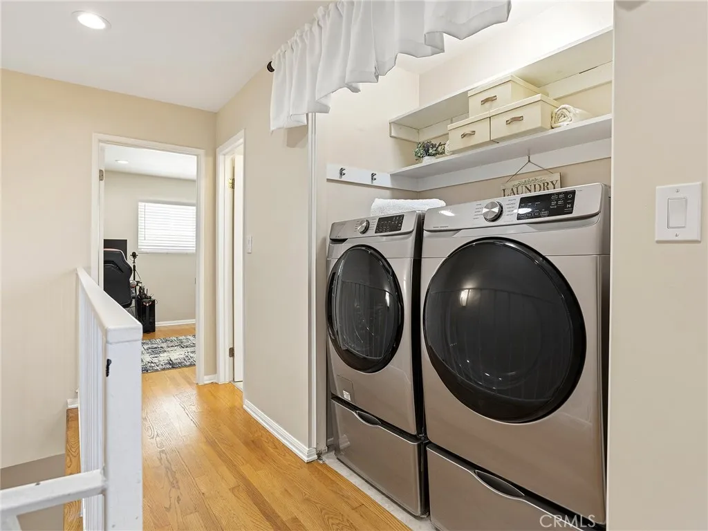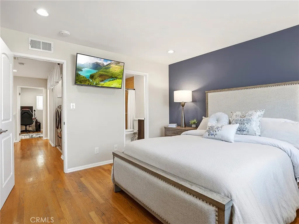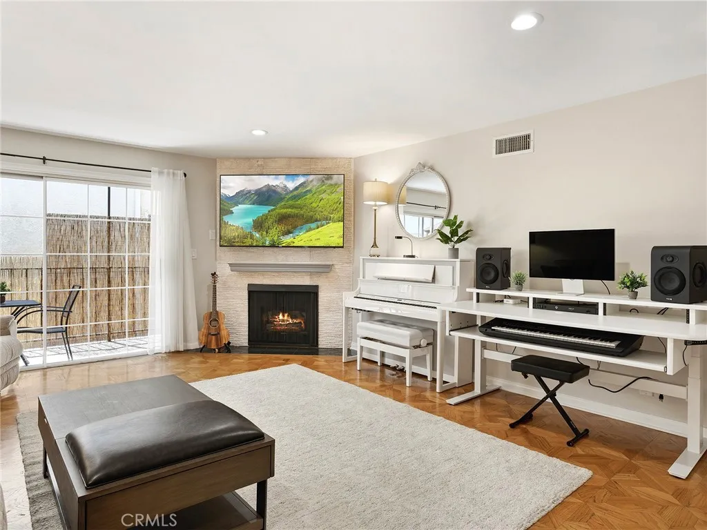 Welcome to this beautifully updated 2 story townhouse offering 1,125 square feet of thoughtfully designed living space. This 2 bedroom, 3 bathroom home features a formal entryway that opens into a spacious and inviting layout, including a dedicated formal dining area and a bright living room complete with a cozy fireplace. The remodeled kitchen is equipped with sleek stainless steel appliances, modern finishes, and ample cabinetry, perfect for both everyday living and entertaining. Hardwood floors run throughout, adding warmth and elegance to every room. Both bedrooms are generously sized, and all three bathrooms have been tastefully remodeled with contemporary finishes. The primary bedroom offers peaceful mountain views, creating a relaxing retreat. A unique highlight of the home is a converted closet that serves as a fully functional voiceover recording room, ideal for creatives or remote professionals seeking a quiet, private workspace. Additional features include central heating and air conditioning, in-unit laundry, and a large private patio, freshly painted and enhanced with bamboo for added privacy, providing an ideal space for outdoor relaxation or entertaining. The home also includes 2 side-by-side parking spaces in the garage, complete with storage cabinets and shelving. The well-maintained, gated building offers privacy and a quiet atmosphere, with only eight units. Recent building upgrades include a new roof, fascia, and gutters installed in 2024, along with new windows and refreshed stucco. Three new skylights were added during the roof installation, bringing i