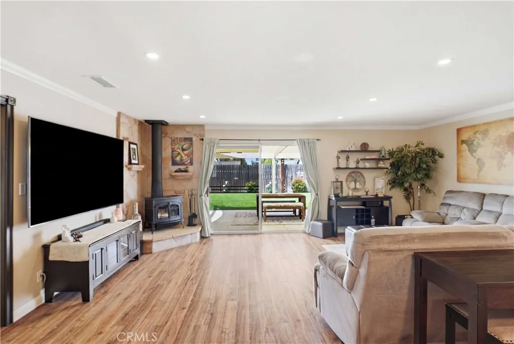 Welcome to this peaceful single-story home in Simi Valley, offering light-filled spaces and a soothing atmosphere that invites you to unwind. Step inside to find updated laminate flooring and a spacious living room enhanced by recessed lighting, a charming stone fireplace with pellet stove, and a sliding glass door that seamlessly connects indoor and outdoor living. The kitchen is thoughtfully designed with ample cabinetry, a stylish tile backsplash, and plenty of space to accommodate everyday cooking and entertaining. The primary bedroom serves as a versatile retreat, ideal for relaxation or a home office setup, while the primary bathroom features a well-appointed vanity and walk-in shower. Additional guest bedrooms provide comfortable accommodations, complemented by a secondary bathroom with an updated vanity and tub/shower combination. The two-car garage is currently configured as a home gym/workshop, offering flexibility to suit a variety of lifestyle needs. Step outside to an entertainers backyard complete with a shaded patio, lush landscaping, and a generous grass area, perfect for gatherings or quiet enjoyment. The home also boasts excellent curb appeal and a tranquil front porch, creating a warm and welcoming first impression. Additional highlights include leased solar for energy efficiency and cost savings, along with convenient proximity to freeway access, shopping, dining, schools, and parks. Thoughtfully updated and move-in ready, this would be a great place to call HOME!
