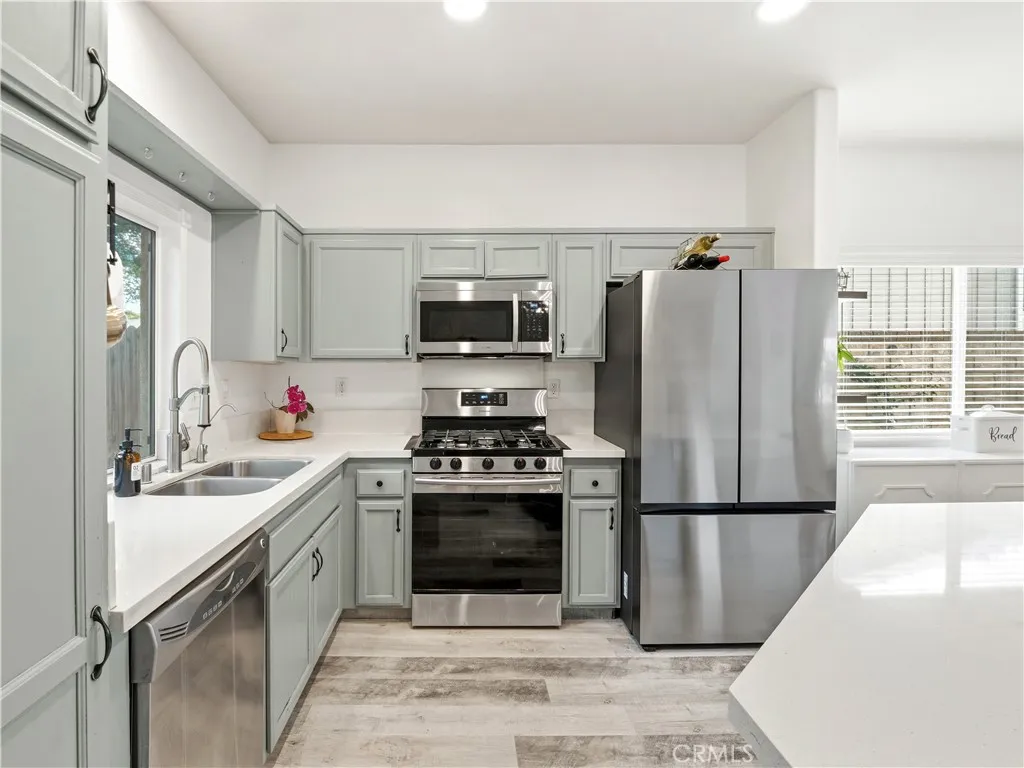 Adorable, trendy 4 bed + 3 bath home in the heart of Newhall near Main Street Newhall, offering over 1,800 sq ft of living space, paid solar, low HOA, and no Mello-Roos taxes with easy access to both the 5 and 14 freeways. This stylish home features a beautifully upgraded kitchen with modern cabinetry, a center island, white quartz countertops, and stainless steel appliances, seamlessly opening to the dining and living areas. The inviting living room showcases a cozy white brick fireplace with mantle, while a charming powder room with designer wallpaper adds a trendy touch downstairs. Upstairs, the spacious primary suite offers a wood accent wall and an upgraded ensuite with dual sink vanity, a stunning glass-enclosed walk-in shower, and a walk-in closet. Three additional well-appointed bedrooms feature stylish wallpaper accents and share a full bathroom. A thoughtfully designed laundry room with cabinetry and folding table adds convenience. Additional highlights include high ceilings, upgraded flooring, modern light fixtures, ceiling fans, and a 2-car direct access garage. Step outside to a private, adorable backyard with a grass area and manicured trees, creating a peaceful outdoor space. Ideally located near downtown Newhall, enjoy close proximity to the Laemmle Newhall theater, shopping, dining, parks, schools, and convenient city transportation. Dont let this one slip away!!!