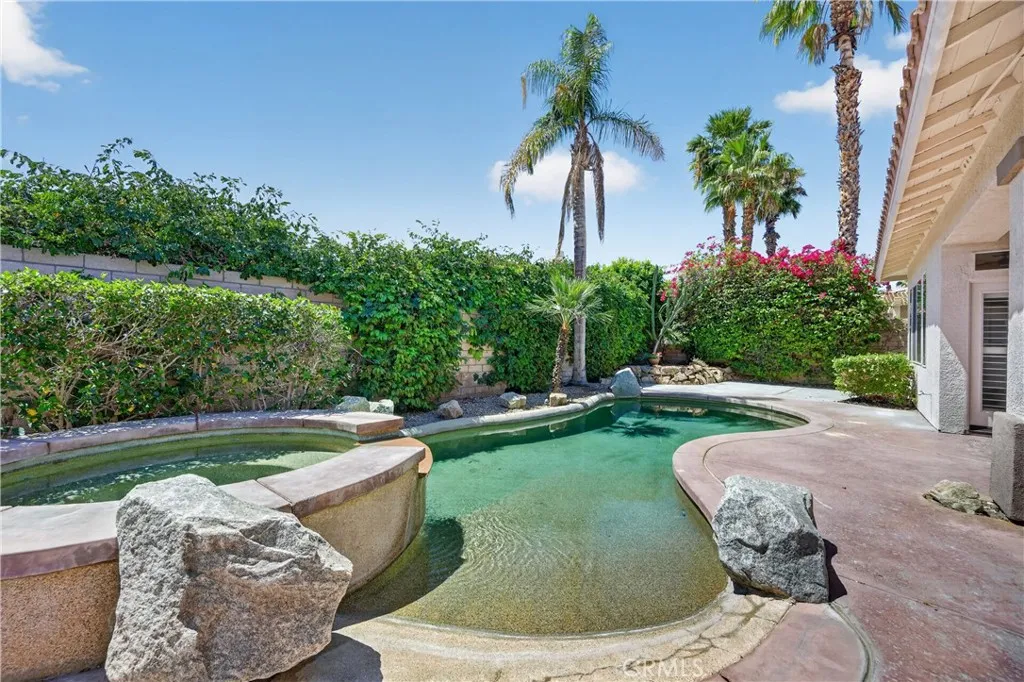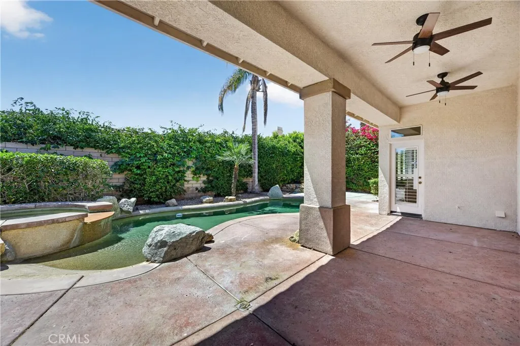 Welcome to 77559 Marlowe Ct, a beautifully upgraded residence in the prestigious gated community of Whitehawk in Palm Desert. This expansive 5-bedroom, 3.5-bathroom is the largest model in the community combining space, style, and true move-in ready convenience. Step inside to a bright, open-concept layout enhanced with brand new luxury vinyl plank flooring, fresh white interior paint, new shutters, and updated lighting and ceiling fans throughout. The fully remodeled kitchen features stunning new quartz countertops, stainless steel appliances, a spacious island, and abundant cabinetry, all flowing seamlessly into the family room with a cozy fireplace and direct access to the front and backyard. The primary suite is a private retreat leading to the pool and spa, along with a beautifully updated spa-like bathroom featuring modern finishes, dual vanities, a soaking tub, and a separate shower. All bathrooms throughout the home have been tastefully upgraded, and each bedroom offers generous space and comfort. Step outside to your private backyard oasis complete with a sparkling pool and spa, covered patio with new outdoor fans, and lush landscaping with mature plants and an exceptional amount of space for entertaining. The detached casita has also been fully updated with modern finishes, new mini-split ac unit and its own bathroom, making it ideal for guests, a home office, or multi-generational living. Located within a secure gated community with low HOA dues that include cable, Wi-Fi, and common area maintenance, residents also enjoy access to a community park and golf cart a