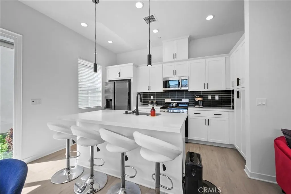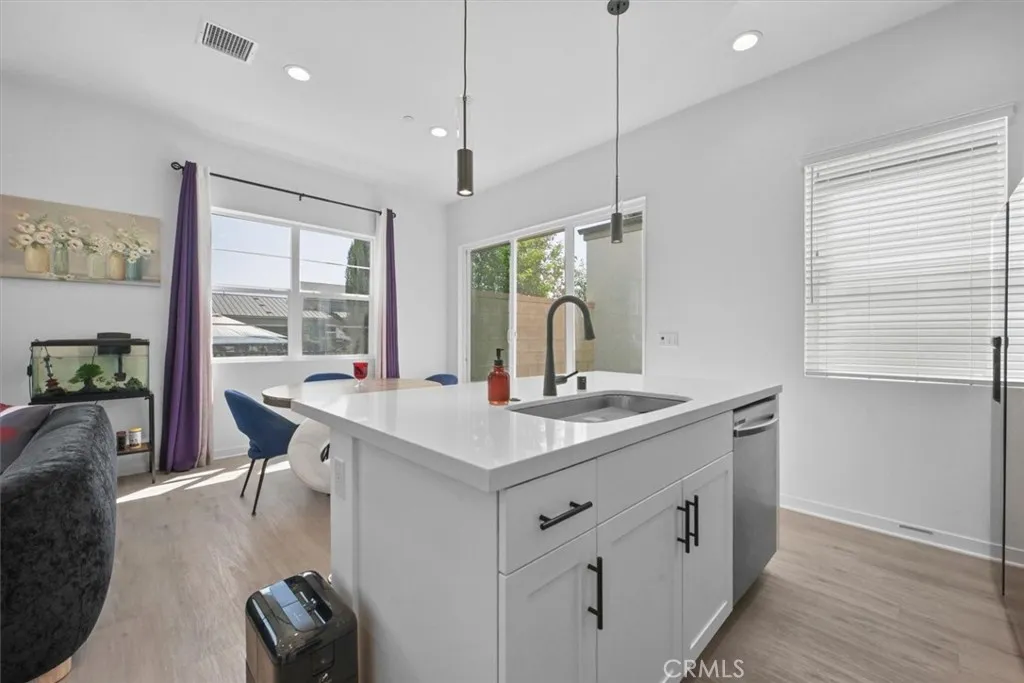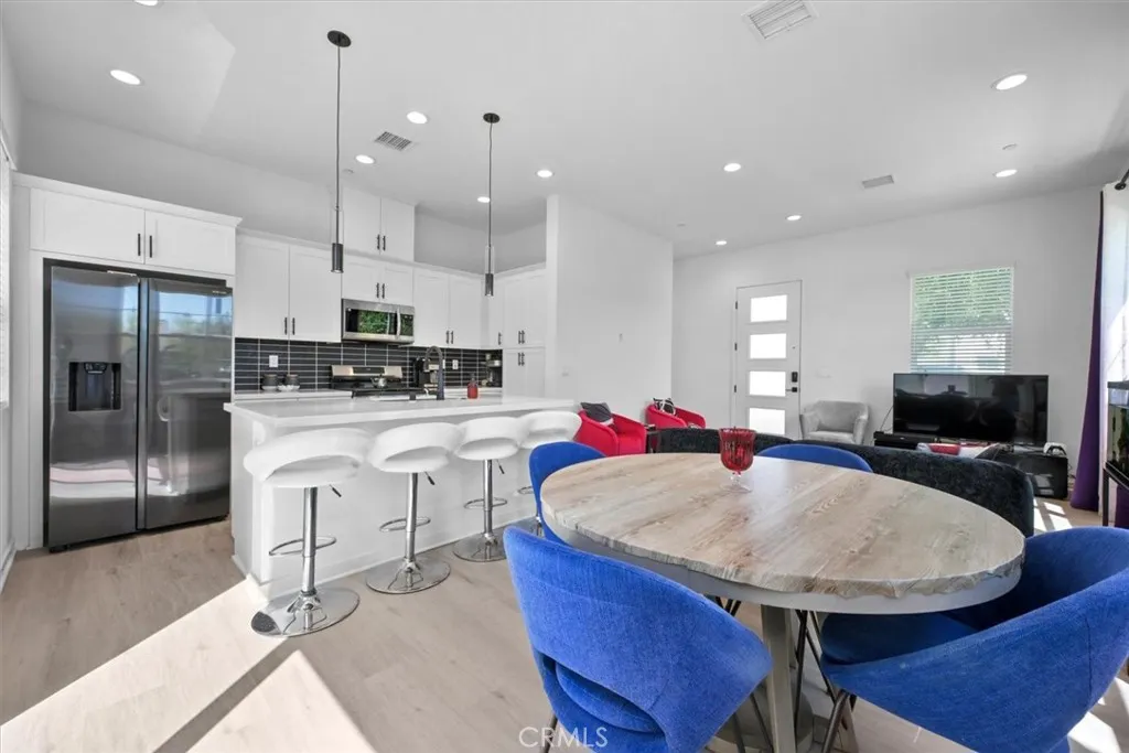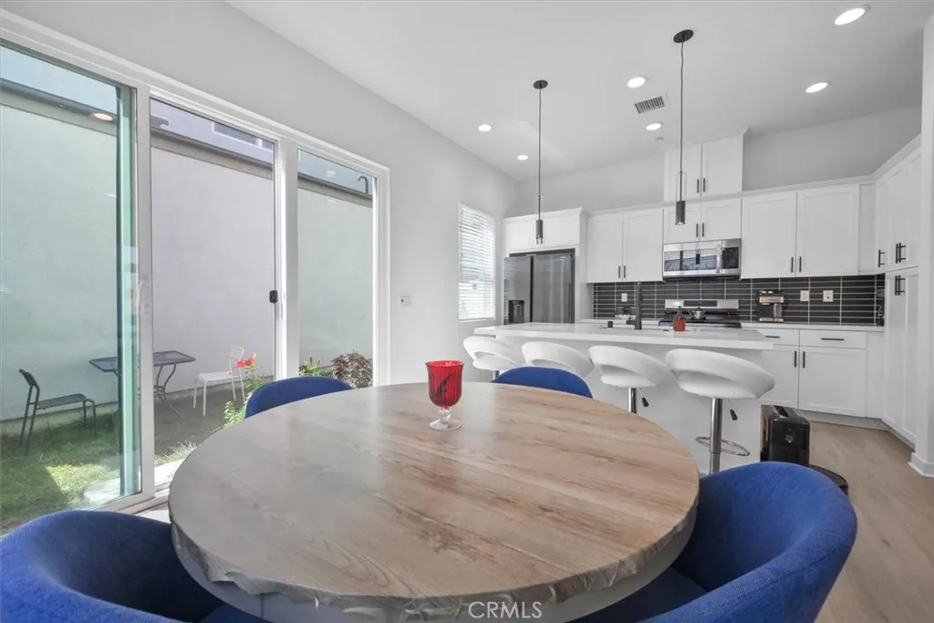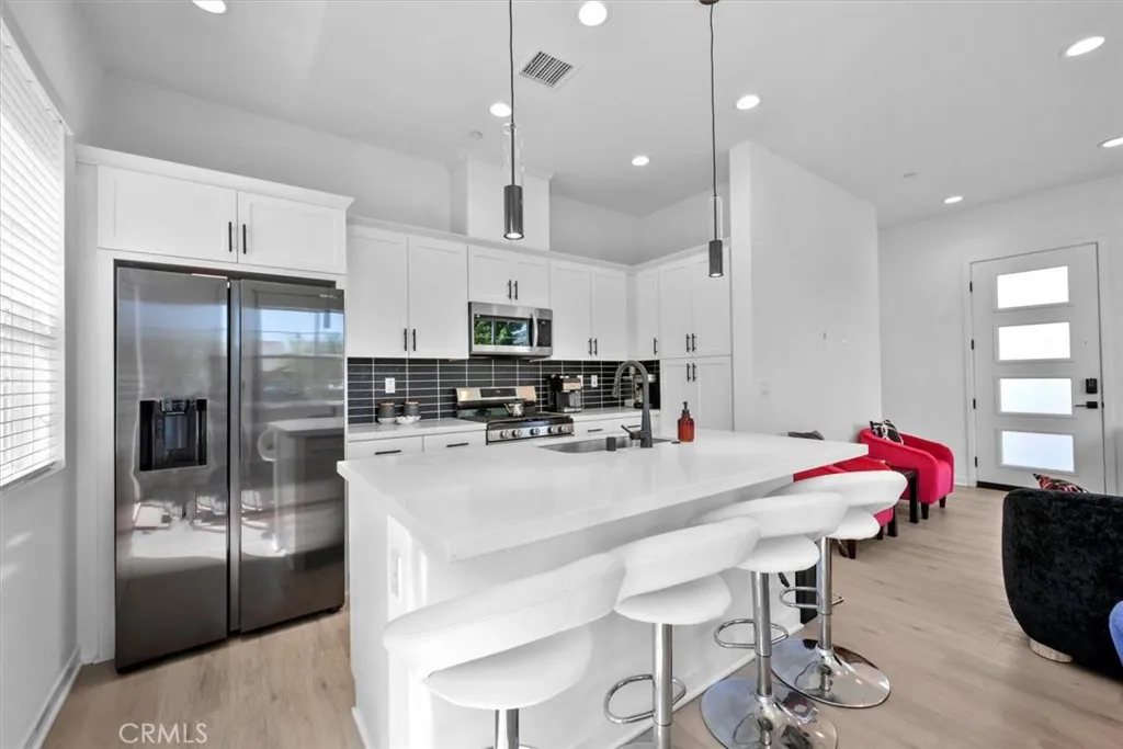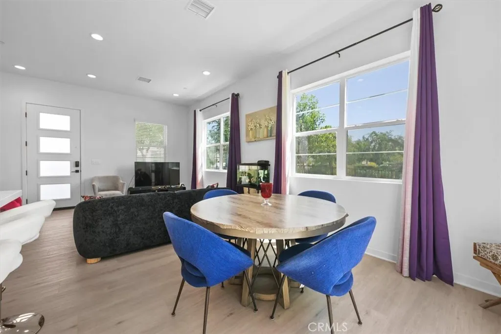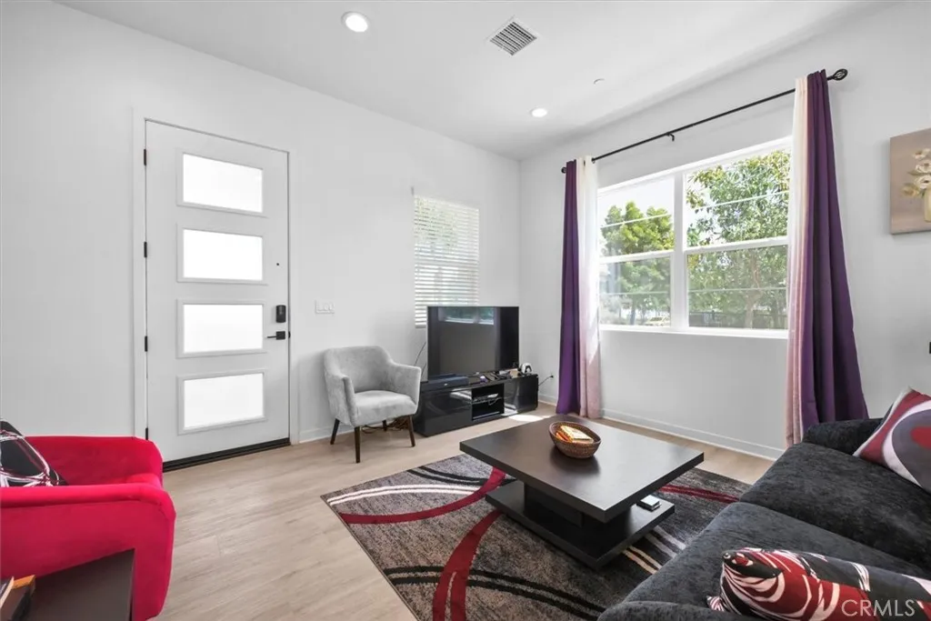 Welcome to Nuvo Parkside! 3-bedroom condo sitting on a corner lot next to the community pool in the gated community within Ontario Ranch is the kind of home that just makes sense and a little bit of why dont I live here yet? all come together. All three bedrooms are tucked upstairs for privacy and the primary bedroom has it's own full bath and a walk-in closet, while the main level is built for real life; an open layout and a kitchen that actually understands how people live. Think ample cabinetry, a spacious island with seating for four, and enough room for everyone to gather, because lets be honest, everyone ends up in the kitchen anyway. Slide open the glass doors just off the kitchen and step into your private backyardperfect for morning coffee, low-maintenance lounging, or finally committing to being a plant person. This home also features a 2-car attached garage and PAID-OFF solar because lower energy bills never go out of style. And lets talk lifestyle: youre right next to the community pool (seriously, its that close), plus youll enjoy resort-style amenities including a spa, modern clubhouse, fitness center, park, and BBQ areas. Whether youre in the mood to unwind or entertain, this community delivers. Wait... there's more! Easy access to the 60 and 15 Freeways, commuting to Los Angeles or Orange County is a breeze. Youre also just minutes from Ontario International Airport, Topgolf, Ontario Mills, and a wide variety of shopping and dining options. This home checks the boxes and adds a little fun to your everyday living - Welcome Home!