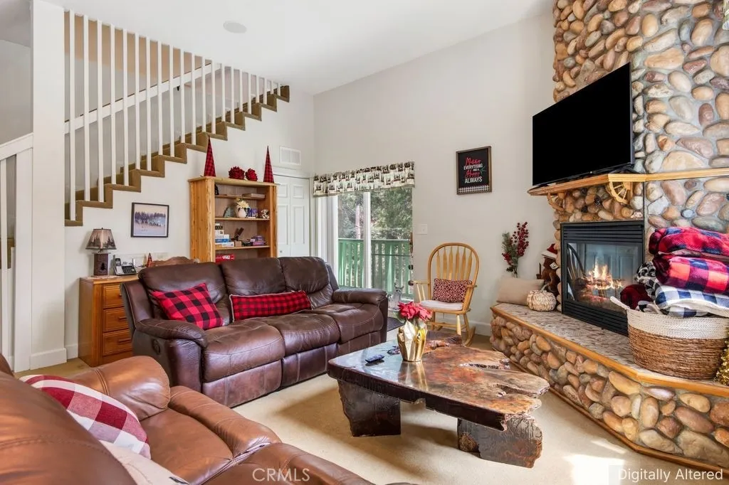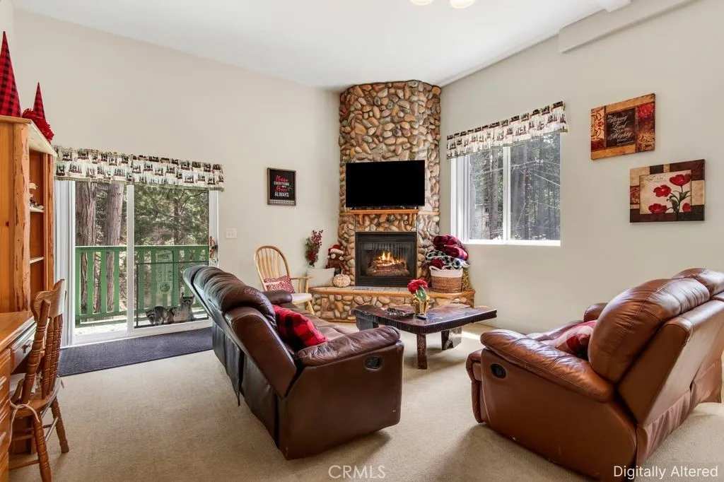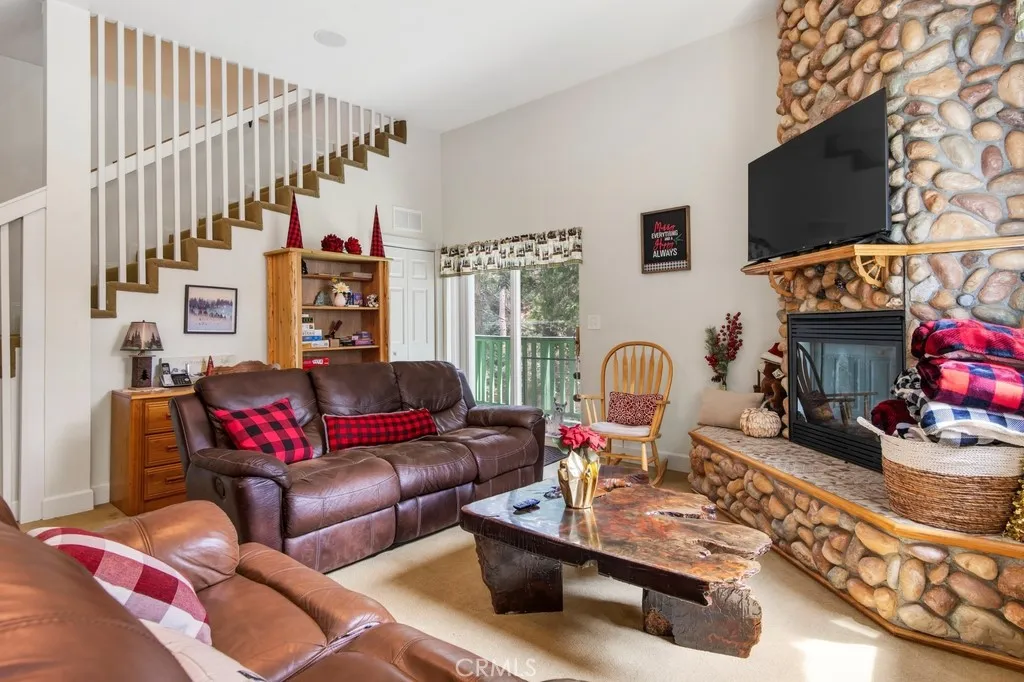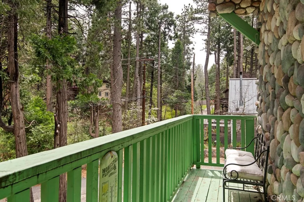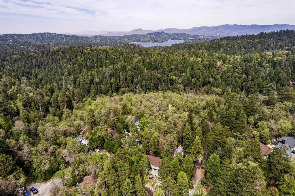 Welcome to this charming split-level mountain home, featuring an additional parcel of property which makes a sprawling over 9,000 sqft yard space. Showcasing a beautiful stone exterior, towering trees, and a spacious deck perfect for enjoying the fresh mountain air and serene surroundings. Set on a double lot in a quiet neighborhood, this property offers both privacy and space, with a seasonal stream running across the front and a gently sloping yard ideal for winter sledding. Inside, the open living and dining area is highlighted by vaulted ceilings and a stunning floor-to-ceiling stone fireplace, creating a warm and inviting atmosphere. The kitchen opens to a bonus area currently used as a game roomperfect for entertaining or additional living space. The home offers a total of five bedrooms and three bathrooms, including a downstairs primary suite with en-suite bathroom and a main-level bedroom for added flexibility. Upstairs, youll find three spacious bedrooms and a full bathroom featuring a jetted soaking tub. A cozy loft nook above the entry and abundant storage closets throughout add to the homes functionality. Enjoy the balcony off the living rooman ideal spot to take in the surrounding natural beauty. Conveniently located near California State Route 18, providing easy access down the mountain, and just minutes from Lake Arrowhead Village, SkyPark at Santa's Village, and Lake Gregory for year-round recreation, dining, and entertainment. Additional highlights include parking for six or more vehicles, making this home perfect for hosting family and friends and creating