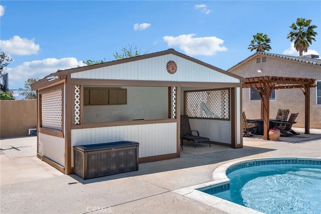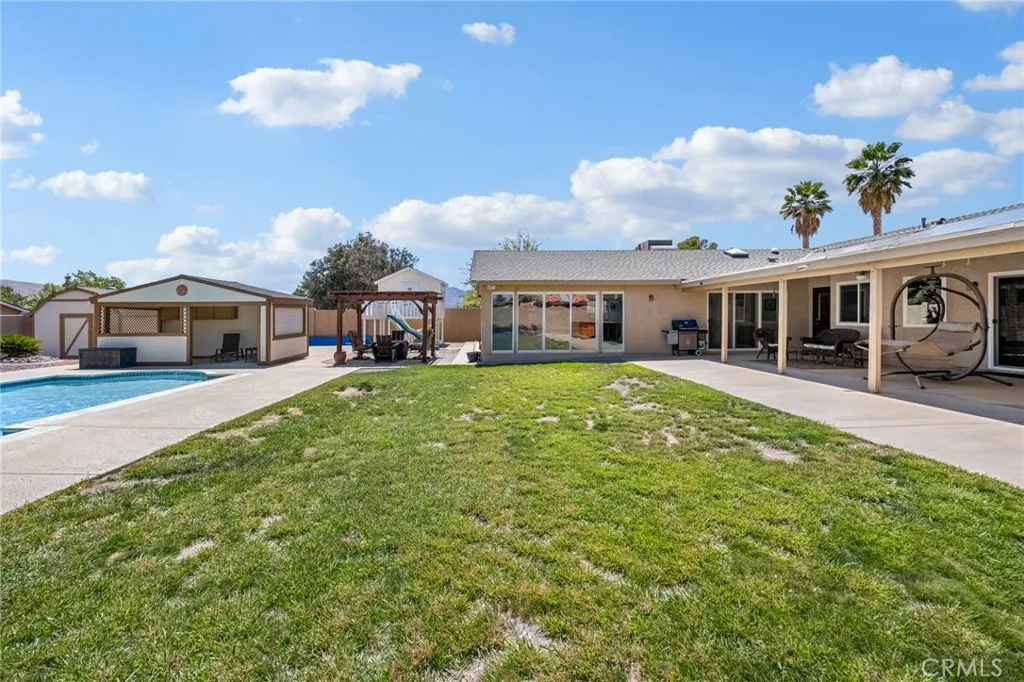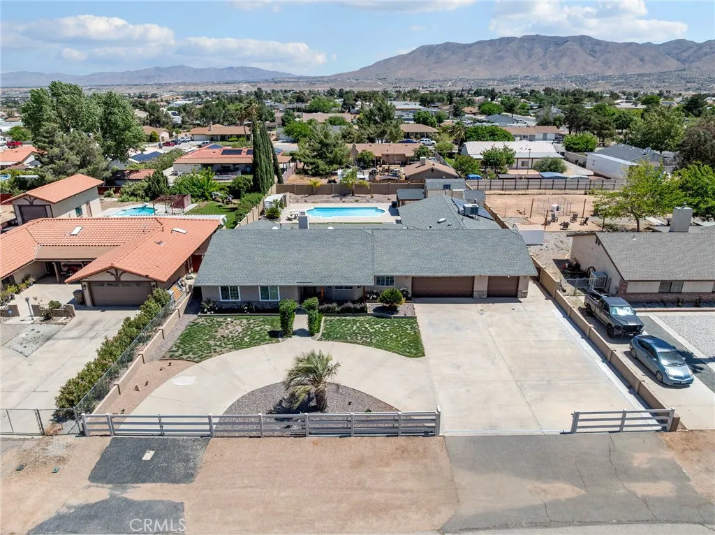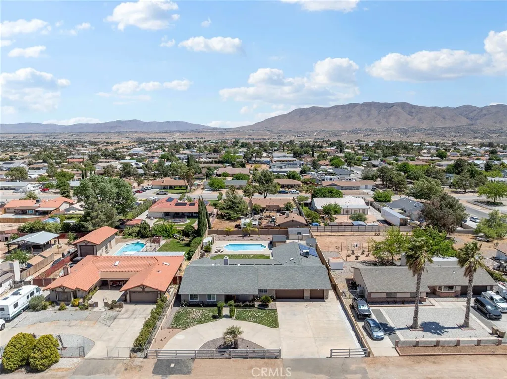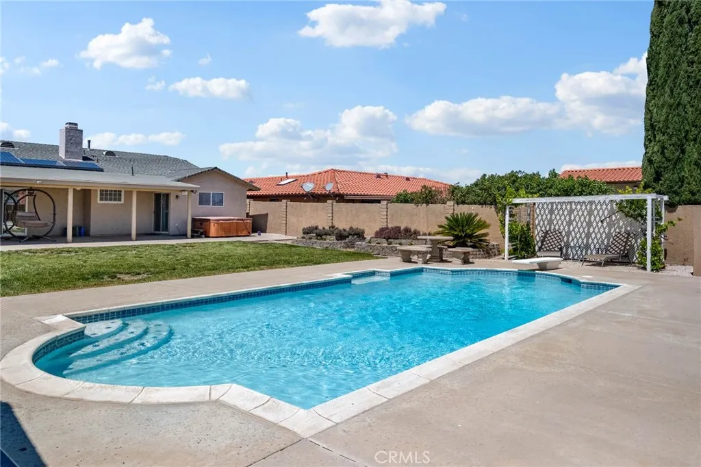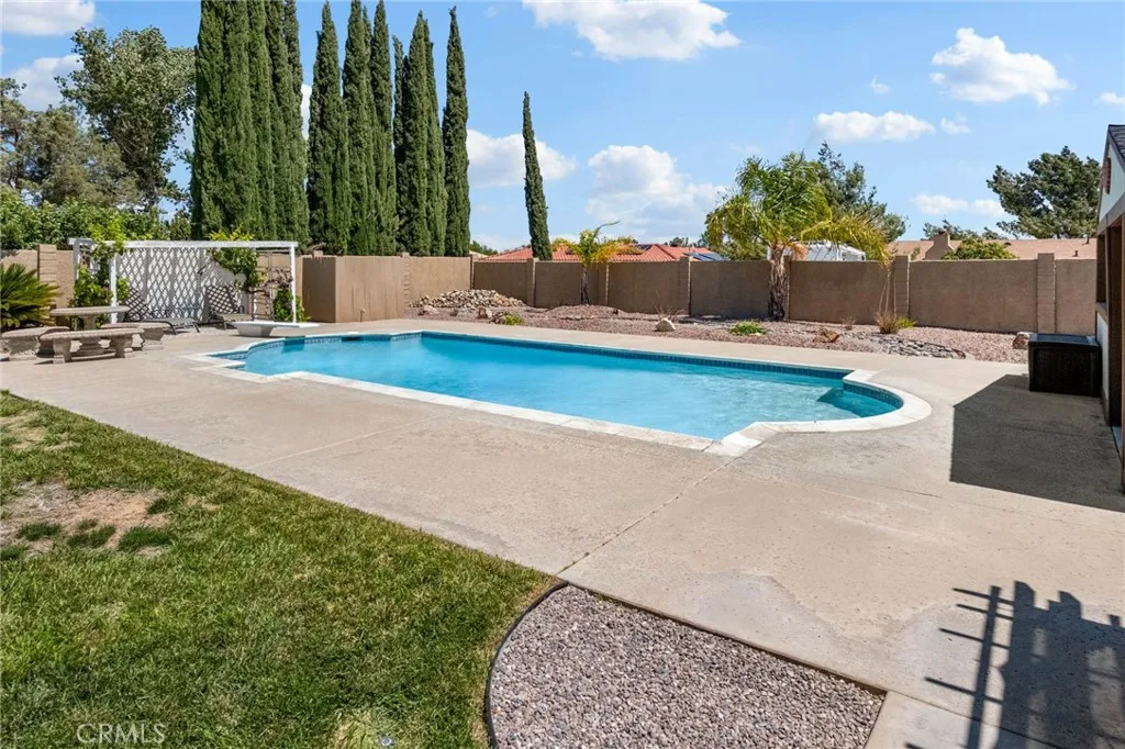 Welcome to this beautifully maintained 4-bedroom, 3-bathroom home located on "The Mesa" in Hesperia, offering a perfect blend of comfort, functionality, and exceptional indoor-outdoor living. From the moment you step inside, youll notice the stunning hardwood floors, plantation shutters throughout, and the pride of ownership that makes this home truly turnkey. The well-designed layout includes a formal living room, dining room, and a cozy reading room featuring a pellet stove and custom built-in storage. The spacious great room (approximately 21 x 27) serves as the heart of the home, complete with tall ceilings, a gas insert fireplace, built-in audio, and a pool table that stays with the property. This versatile space also provides direct access to the fourth bedroom, ideal for guests or multigenerational living. The upgraded kitchen features granite countertops and flows seamlessly into the homes living areas. A highly functional laundry room offers a utility sink and abundant storage, and connects to an additional room providing even more storage along with an oversized pantry. A flex room adjacent to the great room adds versatility for a home office, gym, or playroom and features a skylight that brings in natural light. The recently remodeled third bathroom adds a fresh, modern touch. Step outside to enjoy a backyard designed for both relaxation and entertainment. Large windows and sliding glass doors showcase views of lush green grass and a sparkling blue in-ground pool. The expansive yard features a covered patio protected from both sun and wind, outdoor audio speakers