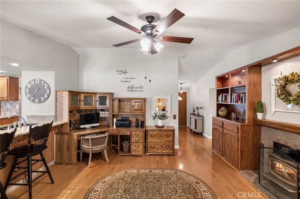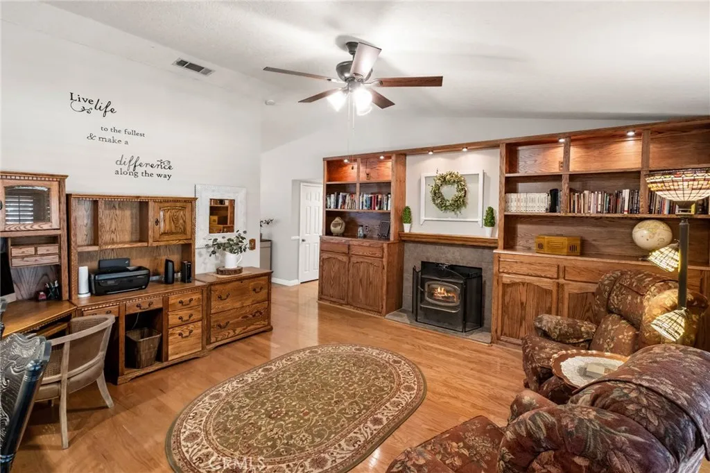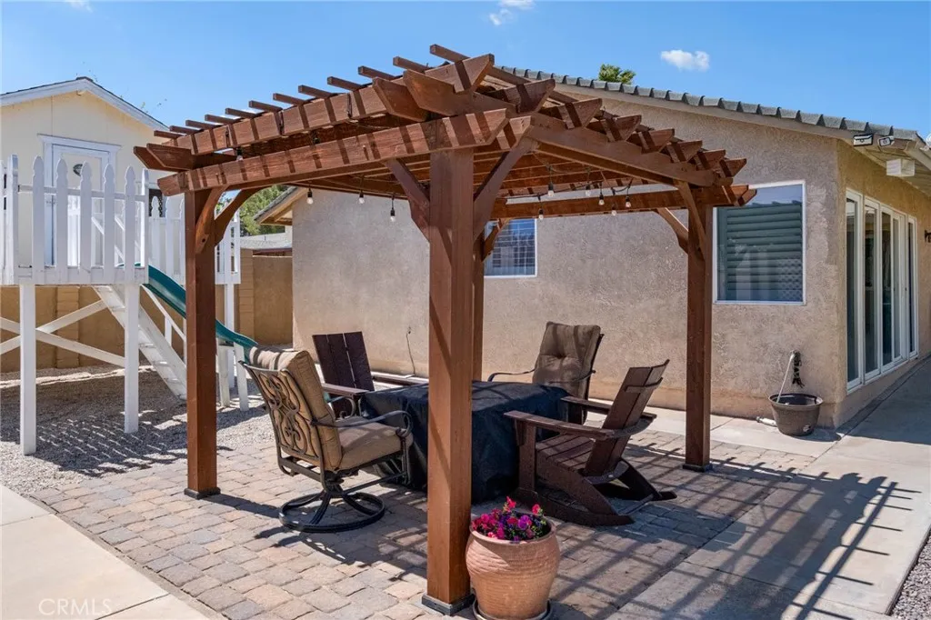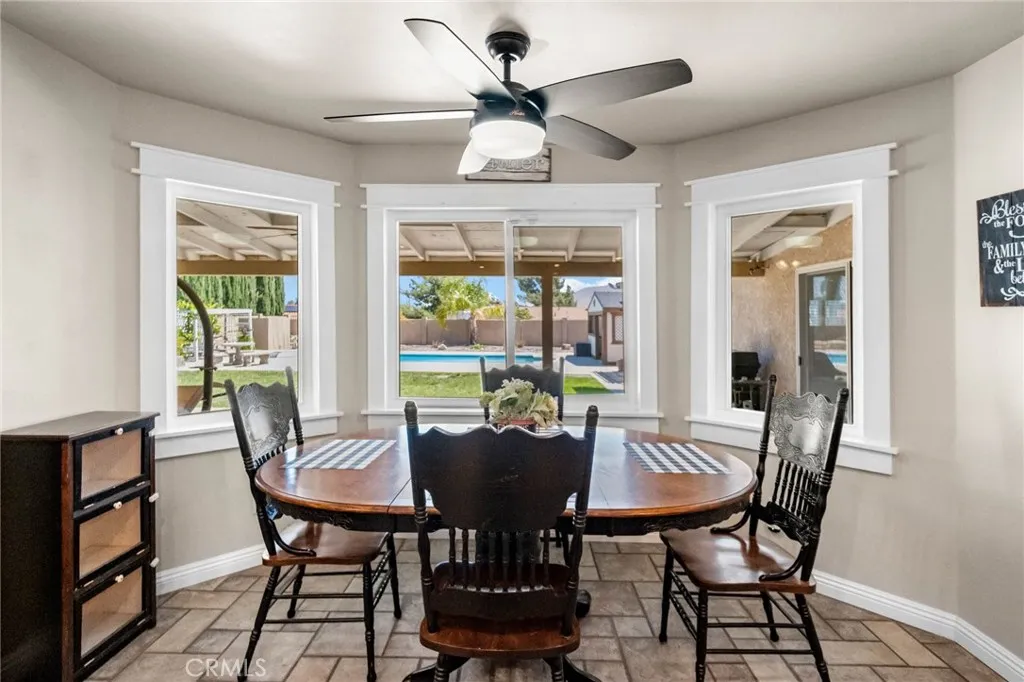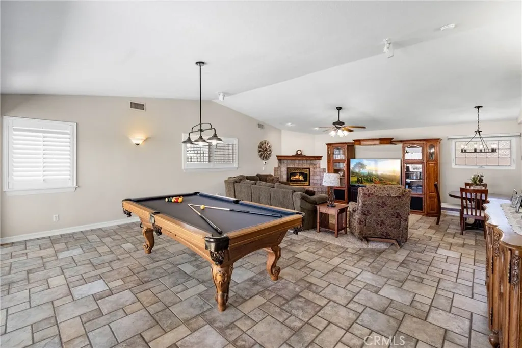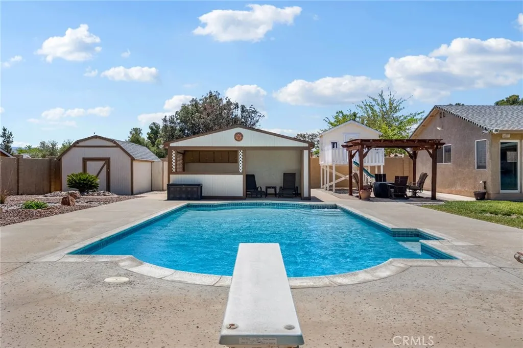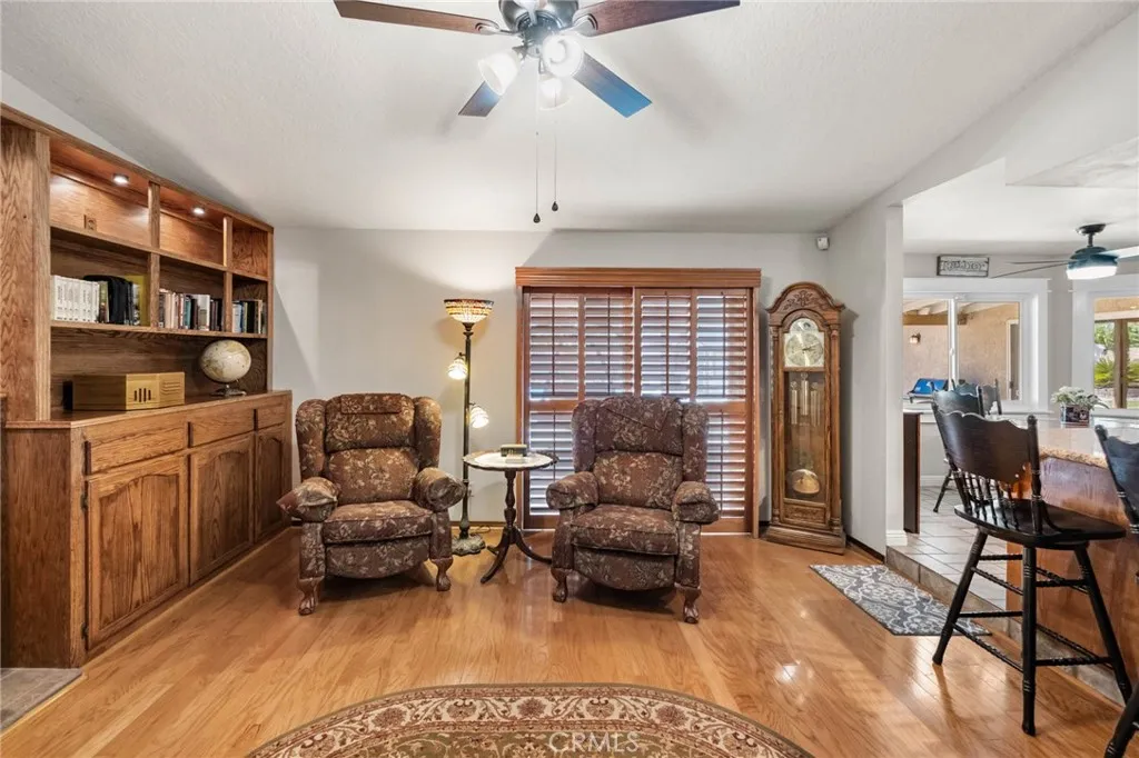 Welcome to this beautifully maintained 4-bedroom, 3-bathroom home located on "The Mesa" in Hesperia, offering a perfect blend of comfort, functionality, and exceptional indoor-outdoor living. From the moment you step inside, youll notice the stunning hardwood floors, plantation shutters throughout, and the pride of ownership that makes this home truly turnkey. The well-designed layout includes a formal living room, dining room, and a cozy reading room featuring a pellet stove and custom built-in storage. The spacious great room (approximately 21 x 27) serves as the heart of the home, complete with tall ceilings, a gas insert fireplace, built-in audio, and a pool table that stays with the property. This versatile space also provides direct access to the fourth bedroom, ideal for guests or multigenerational living. The upgraded kitchen features granite countertops and flows seamlessly into the homes living areas. A highly functional laundry room offers a utility sink and abundant storage, and connects to an additional room providing even more storage along with an oversized pantry. A flex room adjacent to the great room adds versatility for a home office, gym, or playroom and features a skylight that brings in natural light. The recently remodeled third bathroom adds a fresh, modern touch. Step outside to enjoy a backyard designed for both relaxation and entertainment. Large windows and sliding glass doors showcase views of lush green grass and a sparkling blue in-ground pool. The expansive yard features a covered patio protected from both sun and wind, outdoor audio speakers