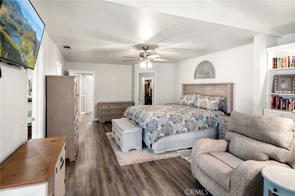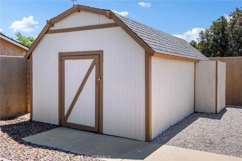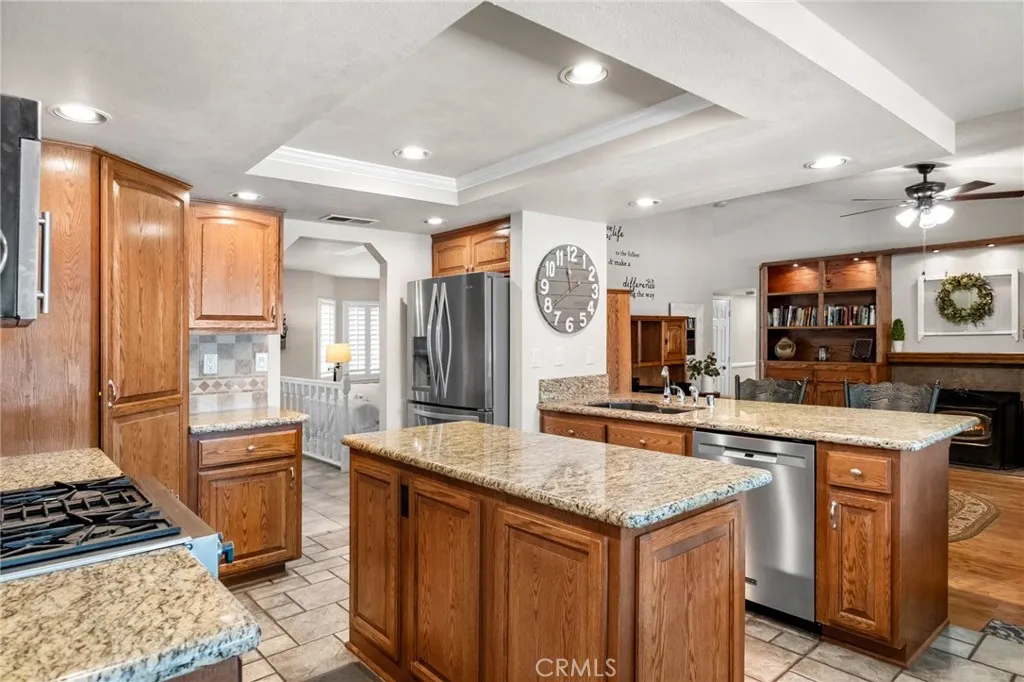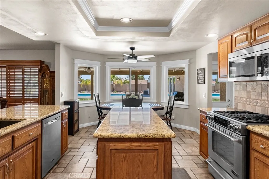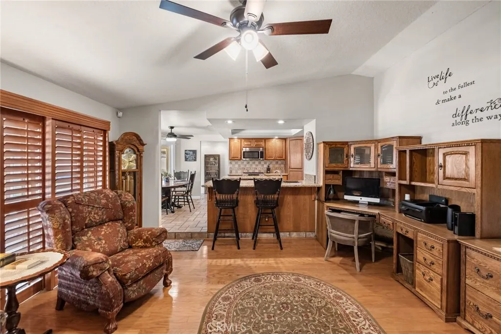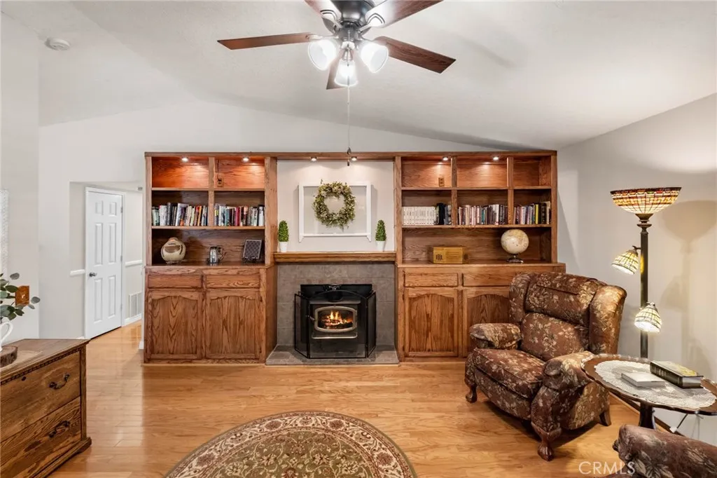 Welcome to this beautifully maintained 4-bedroom, 3-bathroom home located on "The Mesa" in Hesperia, offering a perfect blend of comfort, functionality, and exceptional indoor-outdoor living. From the moment you step inside, youll notice the stunning hardwood floors, plantation shutters throughout, and the pride of ownership that makes this home truly turnkey. The well-designed layout includes a formal living room, dining room, and a cozy reading room featuring a pellet stove and custom built-in storage. The spacious great room (approximately 21 x 27) serves as the heart of the home, complete with tall ceilings, a gas insert fireplace, built-in audio, and a pool table that stays with the property. This versatile space also provides direct access to the fourth bedroom, ideal for guests or multigenerational living. The upgraded kitchen features granite countertops and flows seamlessly into the homes living areas. A highly functional laundry room offers a utility sink and abundant storage, and connects to an additional room providing even more storage along with an oversized pantry. A flex room adjacent to the great room adds versatility for a home office, gym, or playroom and features a skylight that brings in natural light. The recently remodeled third bathroom adds a fresh, modern touch. Step outside to enjoy a backyard designed for both relaxation and entertainment. Large windows and sliding glass doors showcase views of lush green grass and a sparkling blue in-ground pool. The expansive yard features a covered patio protected from both sun and wind, outdoor audio speakers