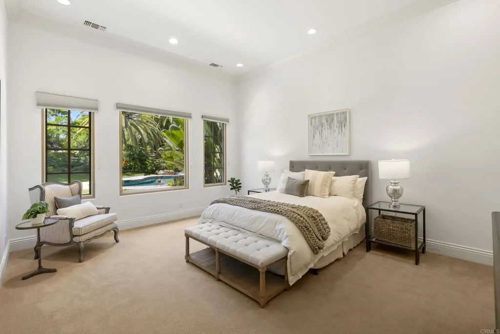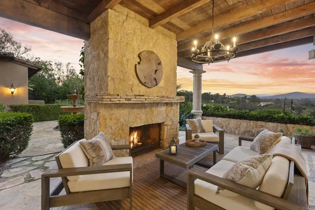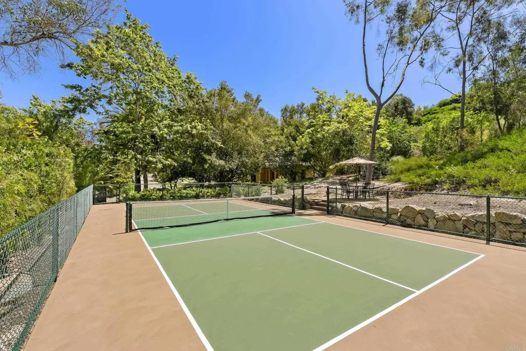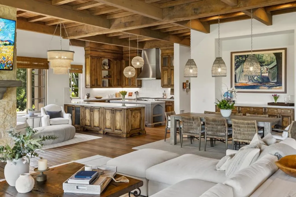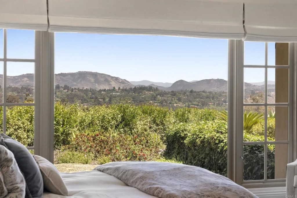 9,703 sq. ft. | 5 BD + Office | 8 BA | 4.78 acres Custom single-level Panoramic mountain views Oversized 4-car garage Detached 1BD/1BA guest house Beach-entry pool + cabana with fireplace New pickleball court Home theater Wine cellar Gourmet kitchen Owned solar Gated entry Tucked behind mature landscaping along an extended gated drive, this single-level, 9,700+ SqFt west Covenant estate sits on 4.78 acres, elevated to capture sweeping mountain views while maintaining a genuine sense of privacy and calm. The location is among the most coveted in the Covenant just minutes to the Village, the Rancho Santa Fe Golf Club, and with easy access to the coast and I-5. Originally inspired by a European countryside retreat, the home has been completely and thoughtfully refreshed honoring its original character while embracing a more open, livable feel. Stone accents, beamed ceilings, wide plank wood floors, and a seamless indoor/outdoor connection form the foundation of the design and carry throughout every space. Capitalizing on its premium single-level, indoor-outdoor design, the layout is both refined and easy to navigate. The kitchen anchored by an oversized island, dual sinks, and generous prep space flows naturally into the great room and dining area, with multiple lift-and-slide doors extending the living space outward to the covered outdoor areas. Panoramic mountain views are present throughout, quietly framing every gathering and everyday moment alike. The floor plan is as functional as it is well-appointed four en-suite bedrooms, a dedicated office with its o